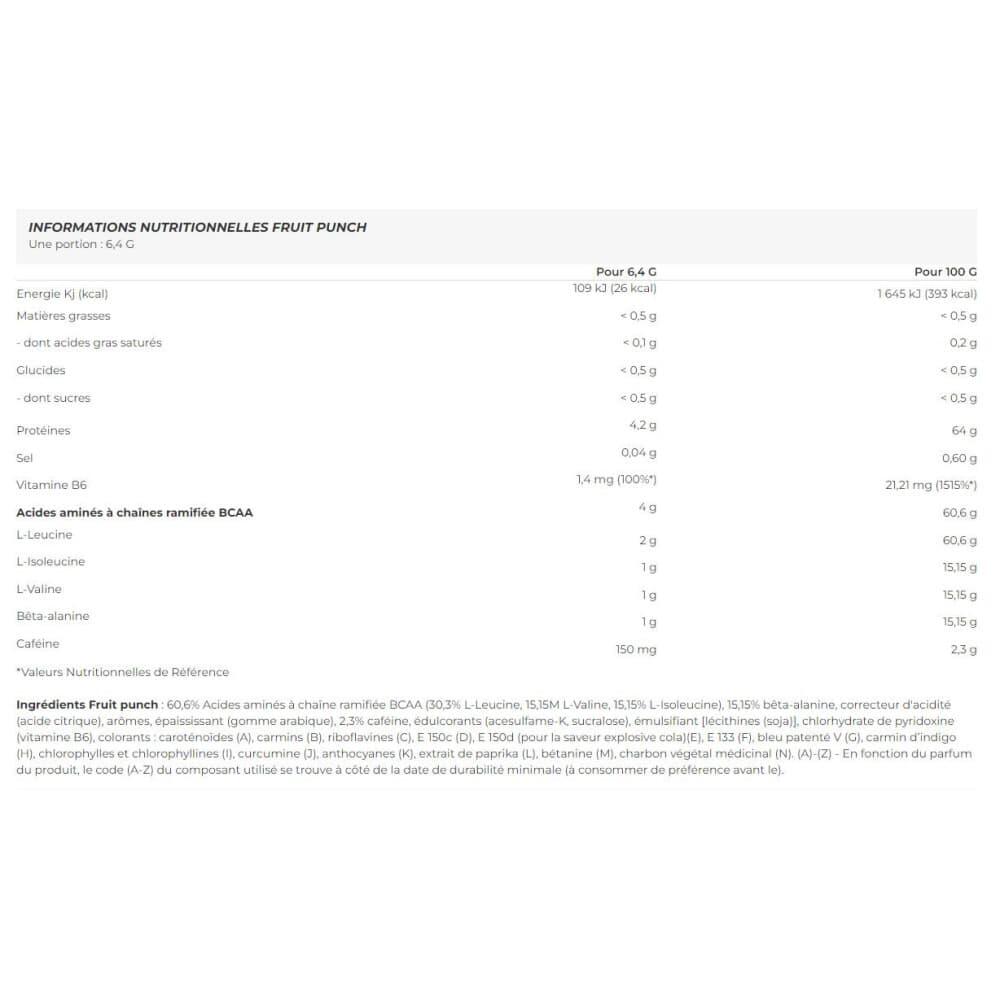 Fruit punch ingredients: BCAA branched-chain amino acids (L-Leucine, L-Valine, L-Isoleucine), beta-alanine, acidity regulator (citric acid), flavourings, thickener (gum arabic), caffeine, sweeteners (acesulfame-K, sucralose), emulsifier [lécithines (soja)], pyridoxine hydrochloride (vitamin B6), colourings : carotenoids (A), carmines (B), riboflavins (C), E 150c (D), E 150d (E), E 133 (F), patent blue V (G), indigo carmine (H), chlorophylls and chlorophyllines (I), curcumin (J), anthocyanins (K), paprika extract (L), betanin (M), medicinal charcoal (N). (A)-(Z) - Depending on the product's flavor, the (A-Z) code of the component used can be found next to the date of minimum durability (best before).Cola ingredients: 60.6% BCAA branched-chain amino acids (30.3% L-Leucine, 15.15M L-Valine, 15.15% L-Isoleucine), 15.15% beta-alanine, acidity regulator (citric acid), flavourings, thickener (gum arabic), 2.3% caffeine, sweeteners (acesulfame-K, sucralose), emulsifier [lécithines (soja)], pyridoxine hydrochloride (vitamin B6), colourings : carotenoids (A), carmines (B), riboflavins (C), E 150c (D), E 150d (for explosive cola flavor)(E), E 133 (F), patent blue V (G), indigo carmine (H), chlorophylls and chlorophyllines (I), curcumin (J), anthocyanins (K), paprika extract (L), betanin (M), medicinal charcoal (N). (A)-(Z) - Depending on the product's flavor, the (A-Z) code of the component used can be found next to the date of minimum durability (best before).