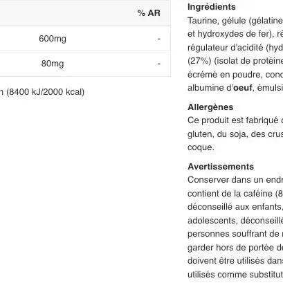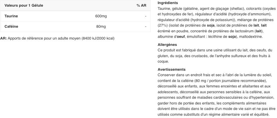 Ingredients: taurine 70.7%, capsule shell [gélatine, agent d'enrobage (shellac), colorant (oxydes de fer et hydroxydes de fer), régulateur d'acidité (hydroxyde d'ammonium), régulateur d'acidité (hydroxyde de potassium)], caffeine 9.4%, maltodextrin.
