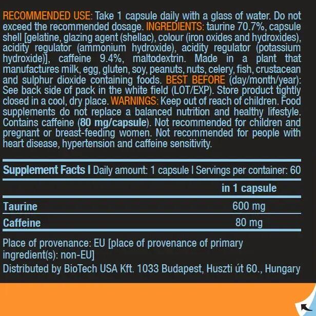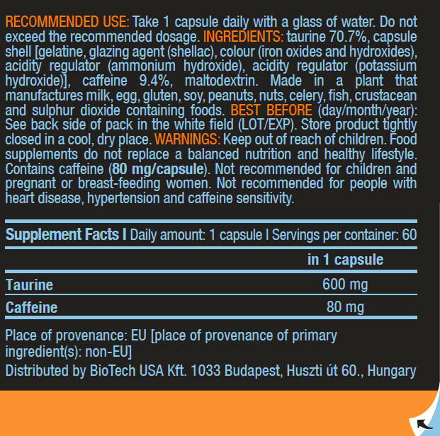 Caffeine + Taurine (60 caps) from Biotech USA is an excellent alternative to poorly dosed energy drinks with a too high carbohydrate content. Caffeine is a central nervous system stimulant that increases metabolism. It also increases alertness and concentration on the performance side. Taken before training, it has a fat burning effect, it promotes thermogenesis and makes you sweat more to burn more calories. Taurine is an amino acid that regulates the heart muscle. It is abundant in the eye area and is one of the constituents of bile. It is essential for the absorption of various minerals. Taurine has an effect on the central nervous system as a stimulant and maintains alertness. Taurine is particularly interesting in case of physical activity. Indeed, it reduces catabolism and increases the force of contraction of the muscle. Better yet, it acts on insulin receptors and is known to increase recovery and performance. Powerful antioxidant, it supports the immune system. Caffeine and taurine combine their effects to stimulate alertness and the nervous system and will make you attack the session with maximum concentration and without losing time!