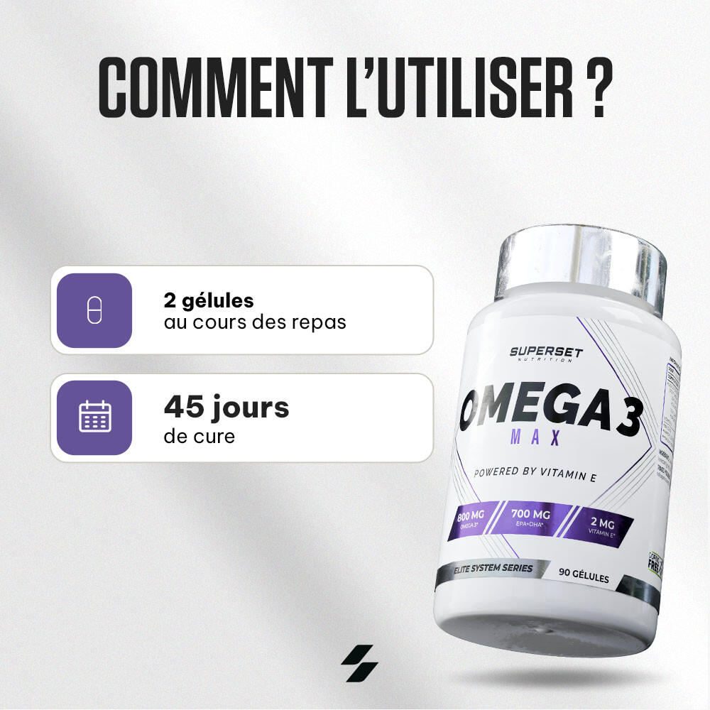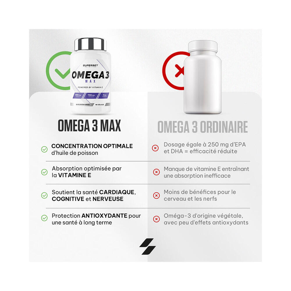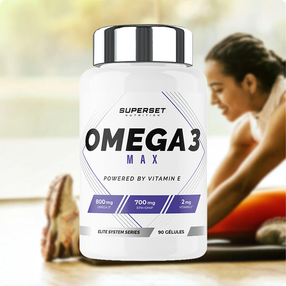 OMEGA 3 MAX (90 CAPS) to support your heart healthOmega-3 is essential for cardiovascular health. OMEGA 3 MAX (90 CAPS) from Superset Nutrition contains 1000 mg of fish oil, rich in omega-3 with an optimal EPA/DHA ratio.This supplement supports heart health and the nervous system, while offering antioxidant protection thanks to vitamin E. Ideal for an active lifestyle, it helps maintain normal heart function and protect cells against oxidative stress.For your general well-beingPolyunsaturated fatty acids, derived from fish oil extract, are essential, as the body cannot synthesize them.This formula protects grey cells to promote good memory and a better mood:Vitamin E improves omega-3 absorptionDHA helps maintain normal cognitive function, especially as we age And to boost your vitalityThis formula contains a high concentration of EPA (400 mg) and DHA (300 mg) to perfectly cover daily needs. Eicosapentaenoic acid (EPA) and docosahexaenoic acid (DHA) contribute to a :Heart health: Omega-3s help reduce blood triglyceride levels, a key factor in heart health.Antioxidant protection: Vitamin E protects your cells against damage caused by oxidative stress.Scientific references :Mozaffarian, D., et al. (2006). 'Fish Intake, Contaminants, and Human Health: Evaluating the Risks and the Benefits.' JAMA.Harris, W. S., et al. (2009). 'Omega-3 Fatty Acids and Cardiovascular Disease: New Recommendations from the American Heart Association.' Circulation.Calder, P. C. (2017). 'Omega-3 fatty acids and inflammatory processes: from molecules to man.' Biochemical Society Transactions.Yurko-Mauro, K., et al. (2010). 'Beneficial effects of docosahexaenoic acid on cognition in age-related cognitive decline.' Alzheimer's & Dementia.Schaefer, E. J., et al. (2006). 'Plasma Phosphatidylcholine Docosahexaenoic Acid Content and Risk of Dementia and Alzheimer Disease: The Framingham Heart Study.' Archives of Neurology.Traber, M. G., & Atkinson, J. (2007). 'Vitamin E, antioxidant and nothing more.' Free Radical Biology and Medicine.Kris-Etherton, P. M., Harris, W. S., & Appel, L. J. (2002). 'Fish Consumption, Fish Oil, Omega-3 Fatty Acids, and Cardiovascular Disease.' Circulation.