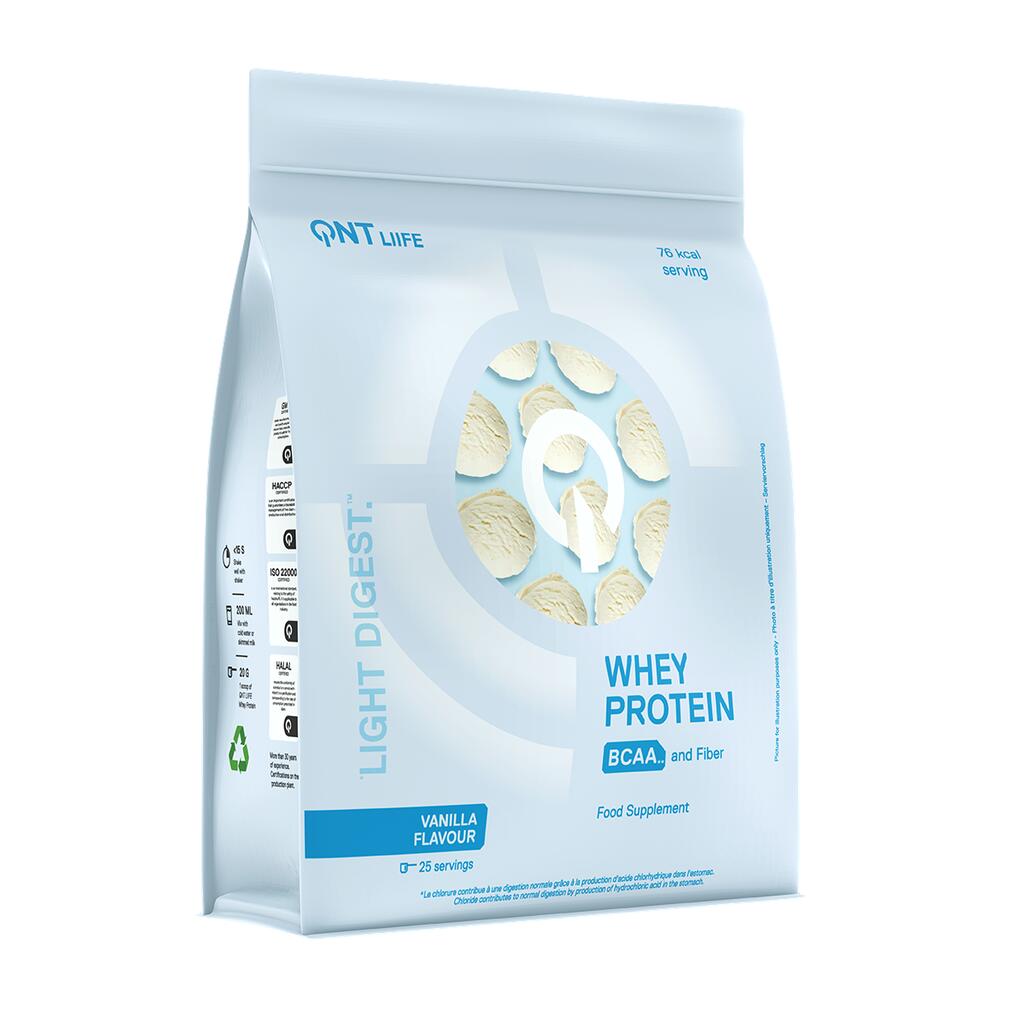NUTRITIONAL INFORMATION Serving size: 20 g Per 20 g Per 100 g Energy Kj (kcal) 321 kJ (77 kcal) 1 603 kJ (384 kcal) Fat content - of which saturated fatty acids 1 g 0,7 g 4,8 g 3,4 g Carbohydrates - of which sugars 1,7 g 1,5 g 8,5 g 7,4 g Fiber 0,6 g 3,1 g Protein 15.5 g 78 g Salt 0,09 g 0,43 g Inulin 620 mg 3 100 mg Chloride (10%*) 80 mg 400 mg L-Leucine (BCAA) 1,698 mg 8,490 mg L-Valine (BCAA) 1,698 mg 5,030 mg L-Isoleucine (BCAA) 1,036 mg 5,180 mg