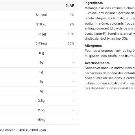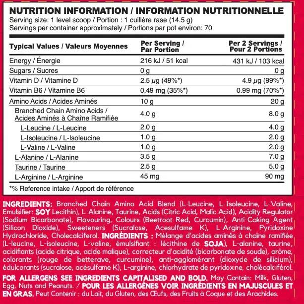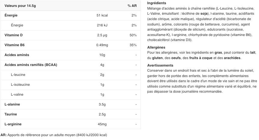 Powdered food supplement based on amino acids and BCAAs to support recovery and muscle growth.