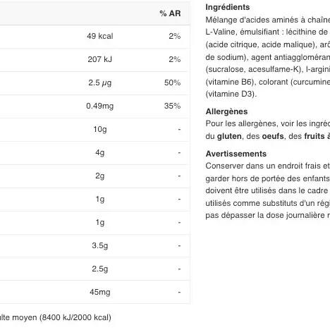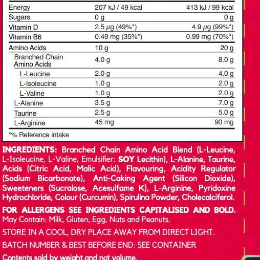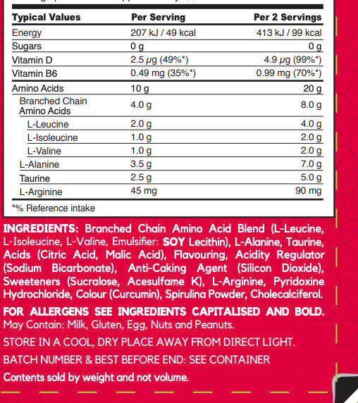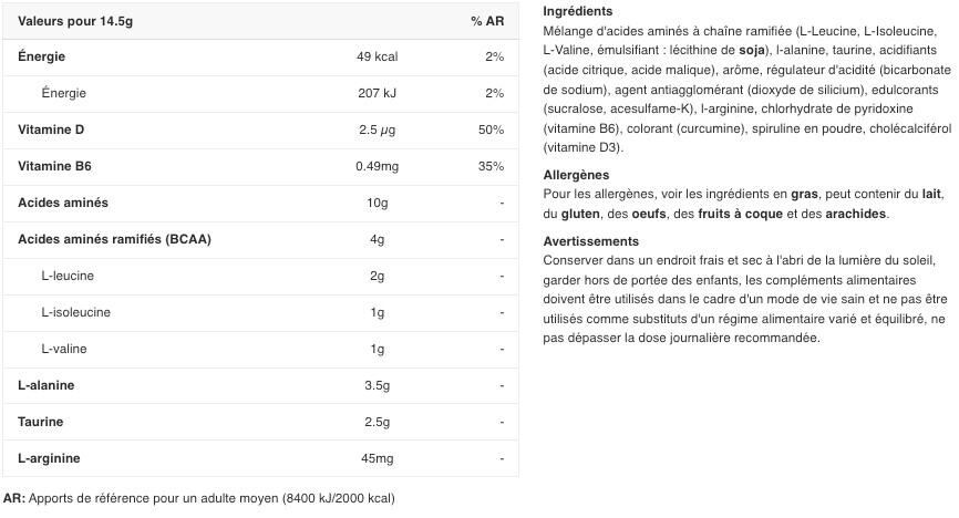 Powdered food supplement based on amino acids and BCAAs to support recovery and muscle growth.