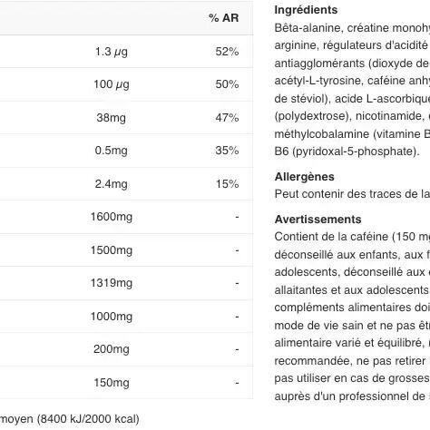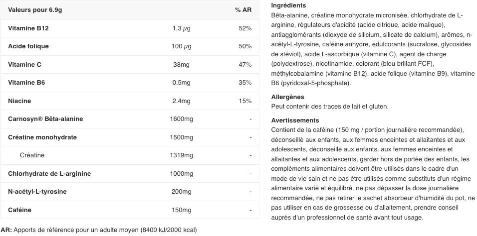 For 100g For 6.5g Vitamin C 577.5 mg 37.5 mg Vitamin B6 7.7 mg 0.5 mg Folic Acid 1.5 mg 0.1 mg Vitamin B12 0.02 mg 0.001 mg CarnoSyn® 23200 mg 1600 mg Micronized Creatine Monohydrate 23100 mg 1500 mg Arginine Alpha Ketoglutarate 15400 mg 1000 mg N-Acetyl L-Tyrosine 3100 mg 200 mg Caffeine anhydrous 2200 mg 150 mg