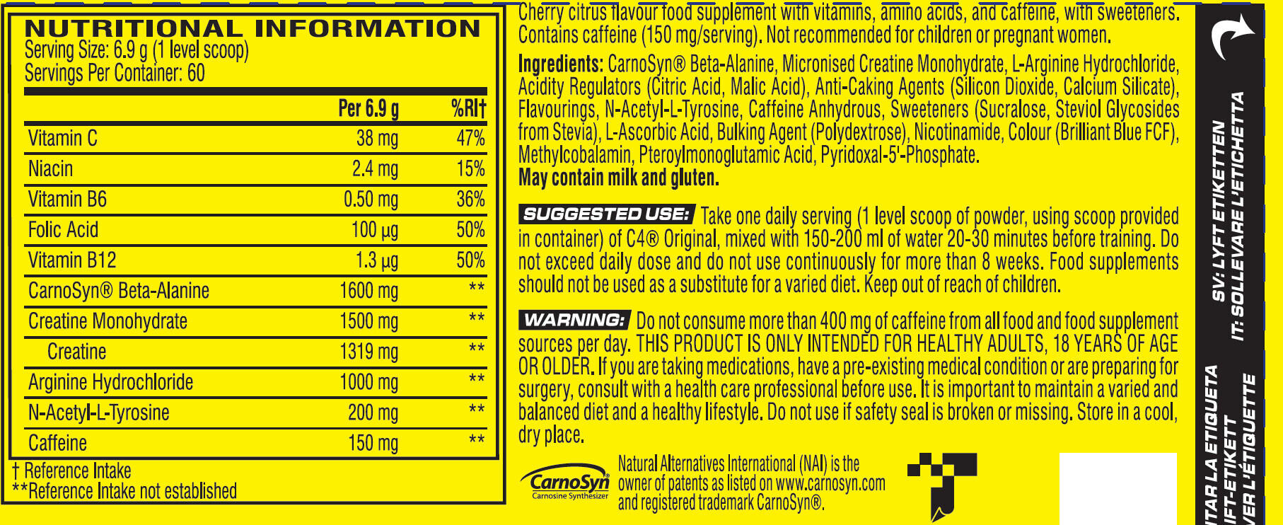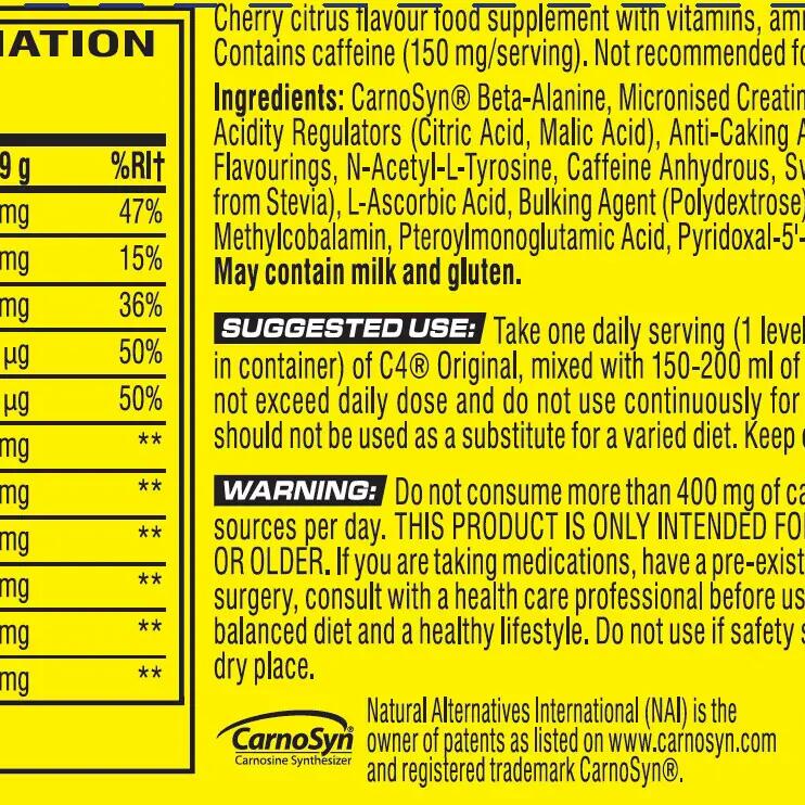After NO3 chrome, a cutting-edge training booster without creatine or stimulants, Cellucor has taken its research one step further to develop a unique pre-workout booster formula that breaks new ground in the family of pre-workout supplements: C4 ORIGINAL (195 g) New Formula! Among the different forms of creatine, Cellucor has chosen to integrate micronized creatine monohydrate, an ultra-filtered form of creatine that allows it to be even purer for optimal assimilation! In addition, C4 Original contains CarnoSyn® beta-alanine, a premium ingredient in sports nutrition products and the only beta-alanine approved (NAI worldwide patent) for use as a dietary supplement. Beta Alanine increases intramuscular carnosine levels, promoting endurance and increasing performance. Beta Alanine pushes the limits of fatigue, buffering lactic acid, allowing you to keep training harder. N-acetyl-L-Tyrosine is the best absorbed and bioavailable form of tyrosine. It is an amino acid precursor of adrenaline that helps increase energy levels and alertness. The formula also contains 150mg of caffeine! C4 Original has been enriched with Vitamin C which contributes to normal energy metabolism and helps reduce fatigue, Vitamin B6 which contributes to normal energy metabolism, normal nervous system function and reduces fatigue, Vitamin B12 which contributes to normal red blood cell formation, fatigue reduction and normal immune system function, as well as folic acid (Vitamin B9).