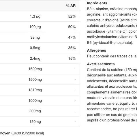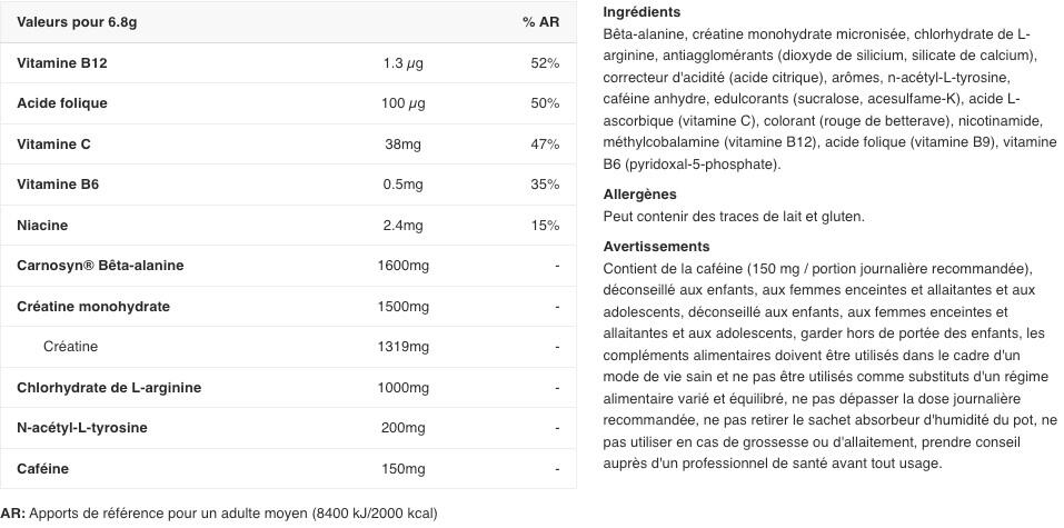For 100g For 6.5g Vitamin C 577.5 mg 37.5 mg Vitamin B6 7.7 mg 0.5 mg Folic Acid 1.5 mg 0.1 mg Vitamin B12 0.02 mg 0.001 mg CarnoSyn® 23200 mg 1600 mg Micronized Creatine Monohydrate 23100 mg 1500 mg Arginine Alpha Ketoglutarate 15400 mg 1000 mg N-Acetyl L-Tyrosine 3100 mg 200 mg Caffeine anhydrous 2200 mg 150 mg