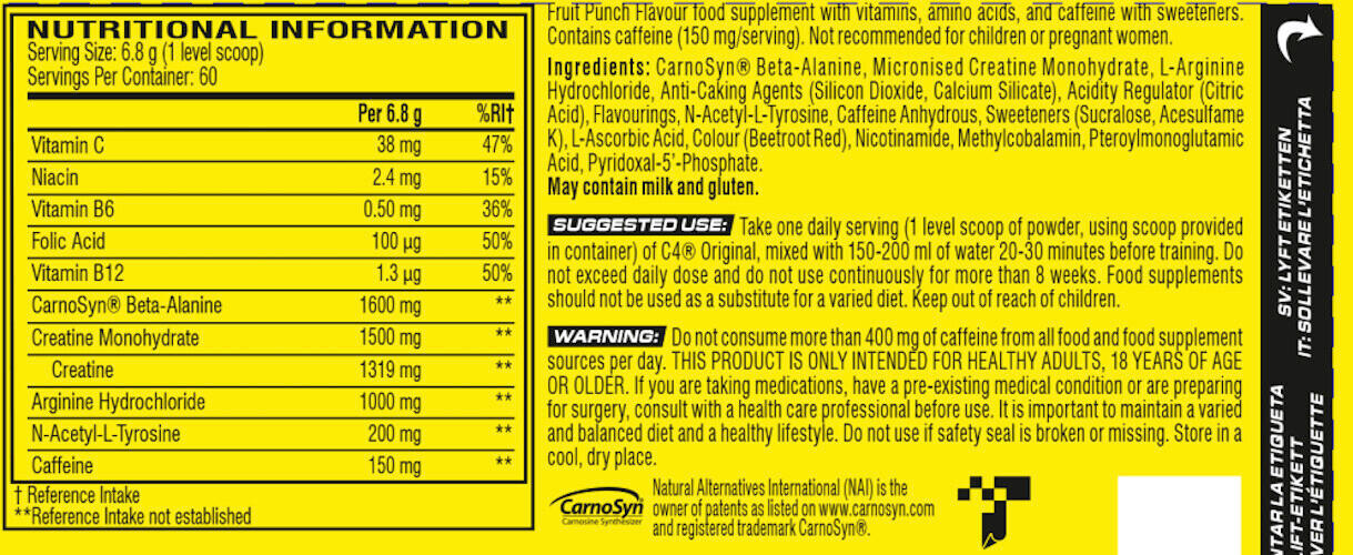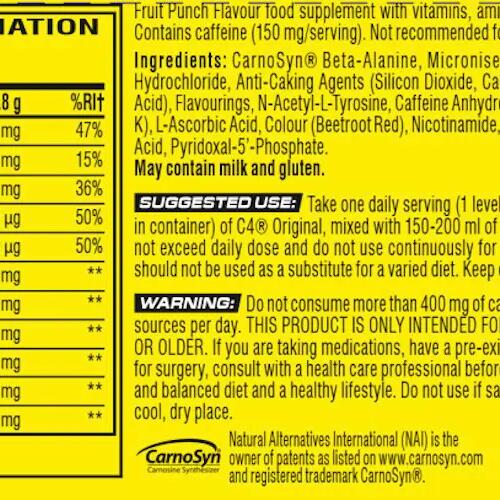 After NO3 chrome, a cutting-edge training booster without creatine or stimulants, Cellucor has taken its research one step further to develop a unique pre-workout booster formula that breaks new ground in the family of pre-workout supplements: C4 ORIGINAL (195 g) New Formula! Among the different forms of creatine, Cellucor has chosen to integrate micronized creatine monohydrate, an ultra-filtered form of creatine that allows it to be even purer for optimal assimilation! In addition, C4 Original contains CarnoSyn® beta-alanine, a premium ingredient in sports nutrition products and the only beta-alanine approved (NAI worldwide patent) for use as a dietary supplement. Beta Alanine increases intramuscular carnosine levels, promoting endurance and increasing performance. Beta Alanine pushes the limits of fatigue, buffering lactic acid, allowing you to keep training harder. N-acetyl-L-Tyrosine is the best absorbed and bioavailable form of tyrosine. It is an amino acid precursor of adrenaline that helps increase energy levels and alertness. The formula also contains 150mg of caffeine! C4 Original has been enriched with Vitamin C which contributes to normal energy metabolism and helps reduce fatigue, Vitamin B6 which contributes to normal energy metabolism, normal nervous system function and reduces fatigue, Vitamin B12 which contributes to normal red blood cell formation, fatigue reduction and normal immune system function, as well as folic acid (Vitamin B9).