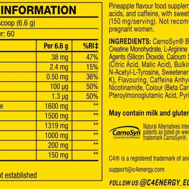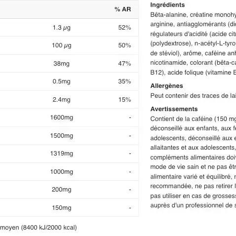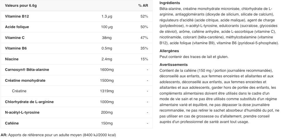 For 100g For 6.5g Vitamin C 577.5 mg 37.5 mg Vitamin B6 7.7 mg 0.5 mg Folic Acid 1.5 mg 0.1 mg Vitamin B12 0.02 mg 0.001 mg CarnoSyn® 23200 mg 1600 mg Micronized Creatine Monohydrate 23100 mg 1500 mg Arginine Alpha Ketoglutarate 15400 mg 1000 mg N-Acetyl L-Tyrosine 3100 mg 200 mg Caffeine anhydrous 2200 mg 150 mg