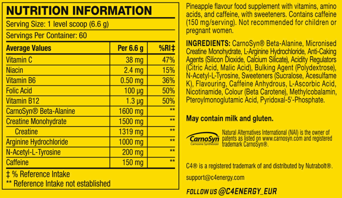 After NO3 chrome, a cutting-edge training booster without creatine or stimulants, Cellucor has taken its research one step further to develop a unique pre-workout booster formula that breaks new ground in the family of pre-workout supplements: C4 ORIGINAL (195 g) New Formula! Among the different forms of creatine, Cellucor has chosen to integrate micronized creatine monohydrate, an ultra-filtered form of creatine that allows it to be even purer for optimal assimilation! In addition, C4 Original contains CarnoSyn® beta-alanine, a premium ingredient in sports nutrition products and the only beta-alanine approved (NAI worldwide patent) for use as a dietary supplement. Beta Alanine increases intramuscular carnosine levels, promoting endurance and increasing performance. Beta Alanine pushes the limits of fatigue, buffering lactic acid, allowing you to keep training harder. N-acetyl-L-Tyrosine is the best absorbed and bioavailable form of tyrosine. It is an amino acid precursor of adrenaline that helps increase energy levels and alertness. The formula also contains 150mg of caffeine! C4 Original has been enriched with Vitamin C which contributes to normal energy metabolism and helps reduce fatigue, Vitamin B6 which contributes to normal energy metabolism, normal nervous system function and reduces fatigue, Vitamin B12 which contributes to normal red blood cell formation, fatigue reduction and normal immune system function, as well as folic acid (Vitamin B9).
