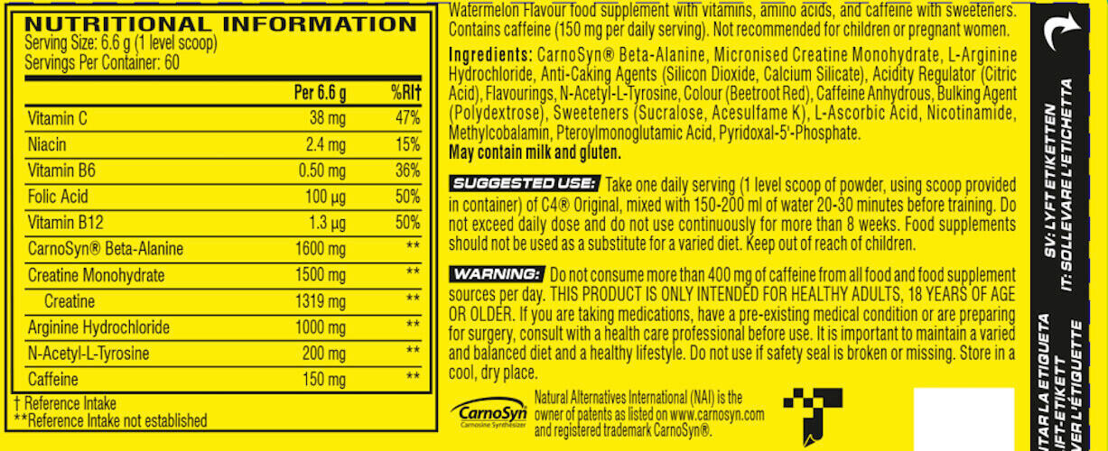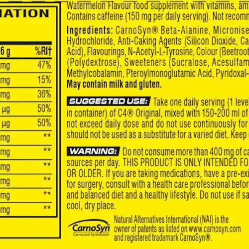 C4 Original has been enriched with Vitamin C which contributes to normal energy metabolism and helps reduce fatigue, Vitamin B6 which contributes to normal energy metabolism, normal nervous system function and reduces fatigue, Vitamin B12 which contributes to normal red blood cell formation, fatigue reduction and normal immune system function, as well as folic acid (Vitamin B9).