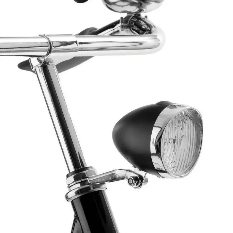 Classic black LED bike headlight — 15 m illuminated range, visible to others up to 1 km, powered by 3×AAA batteries.