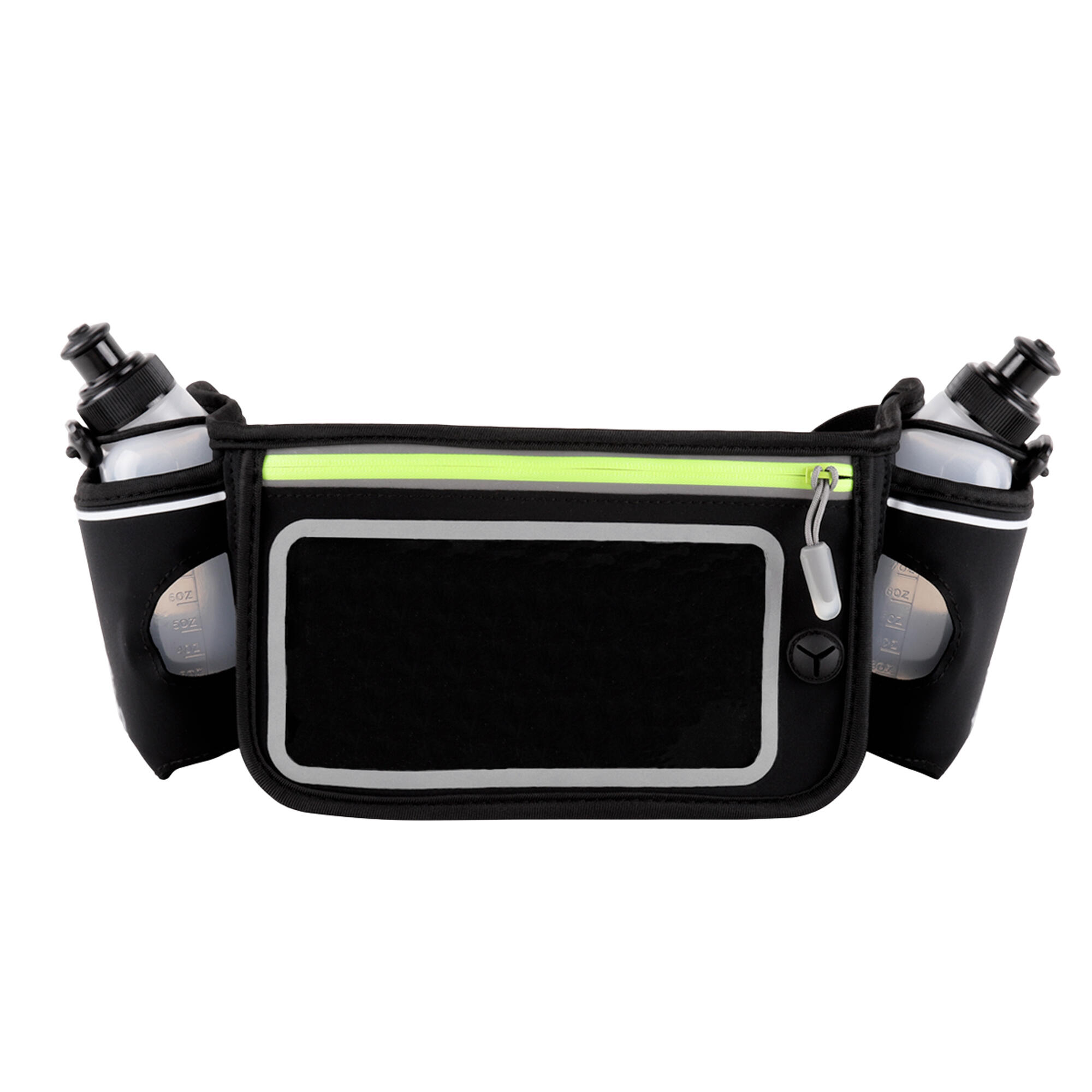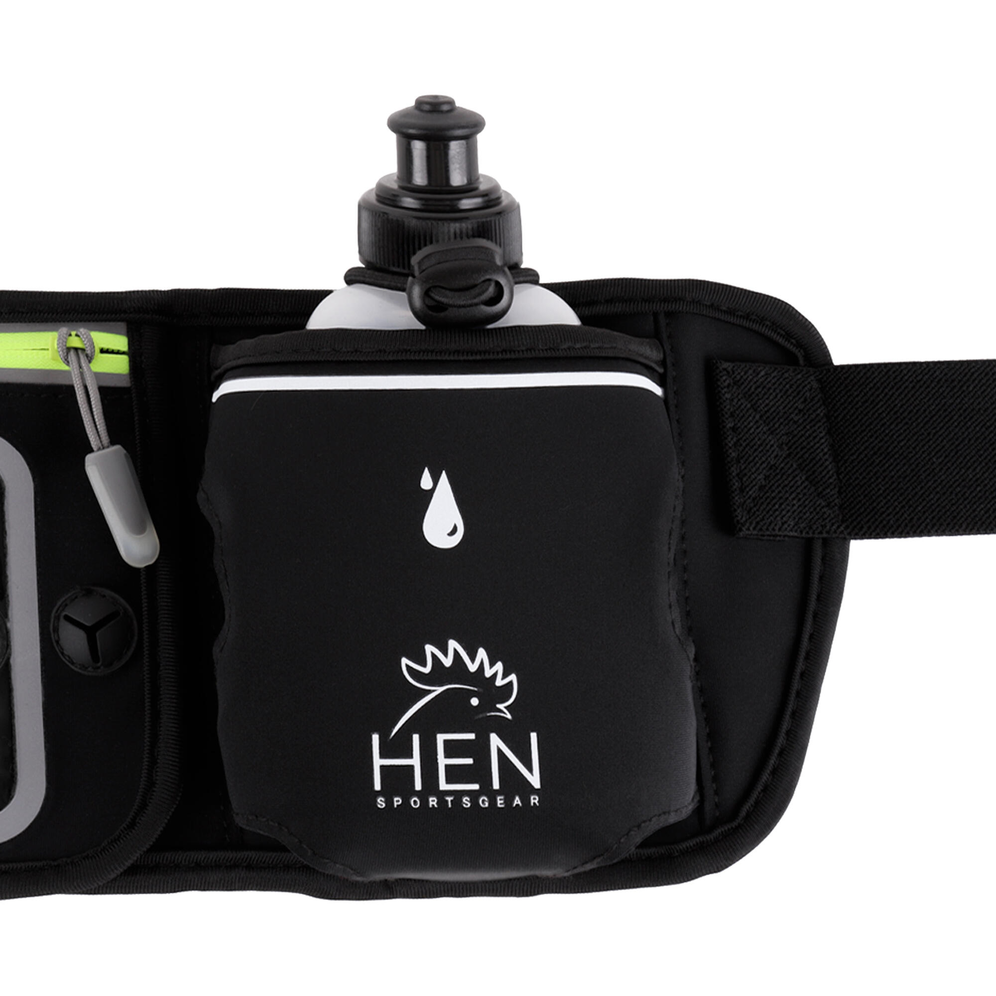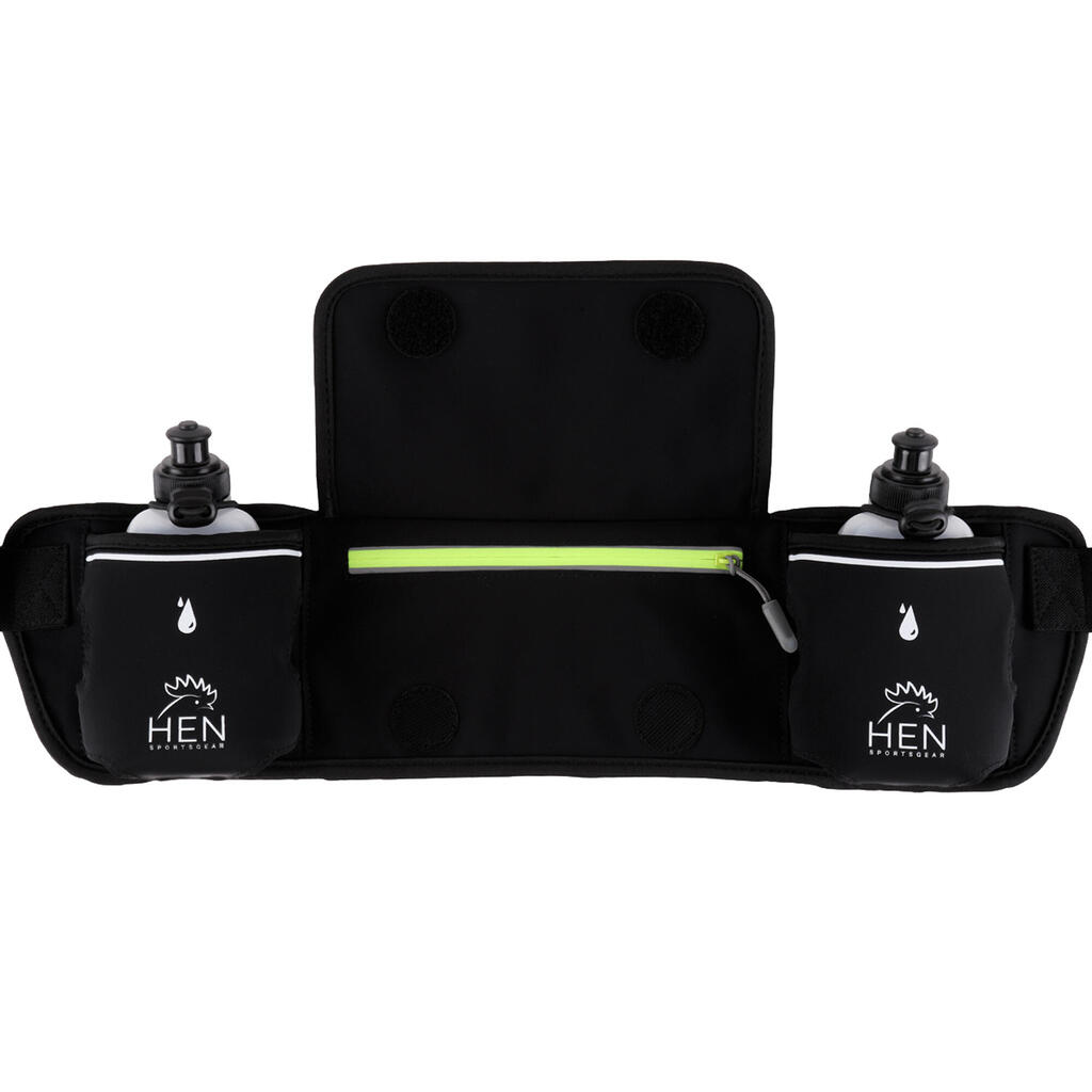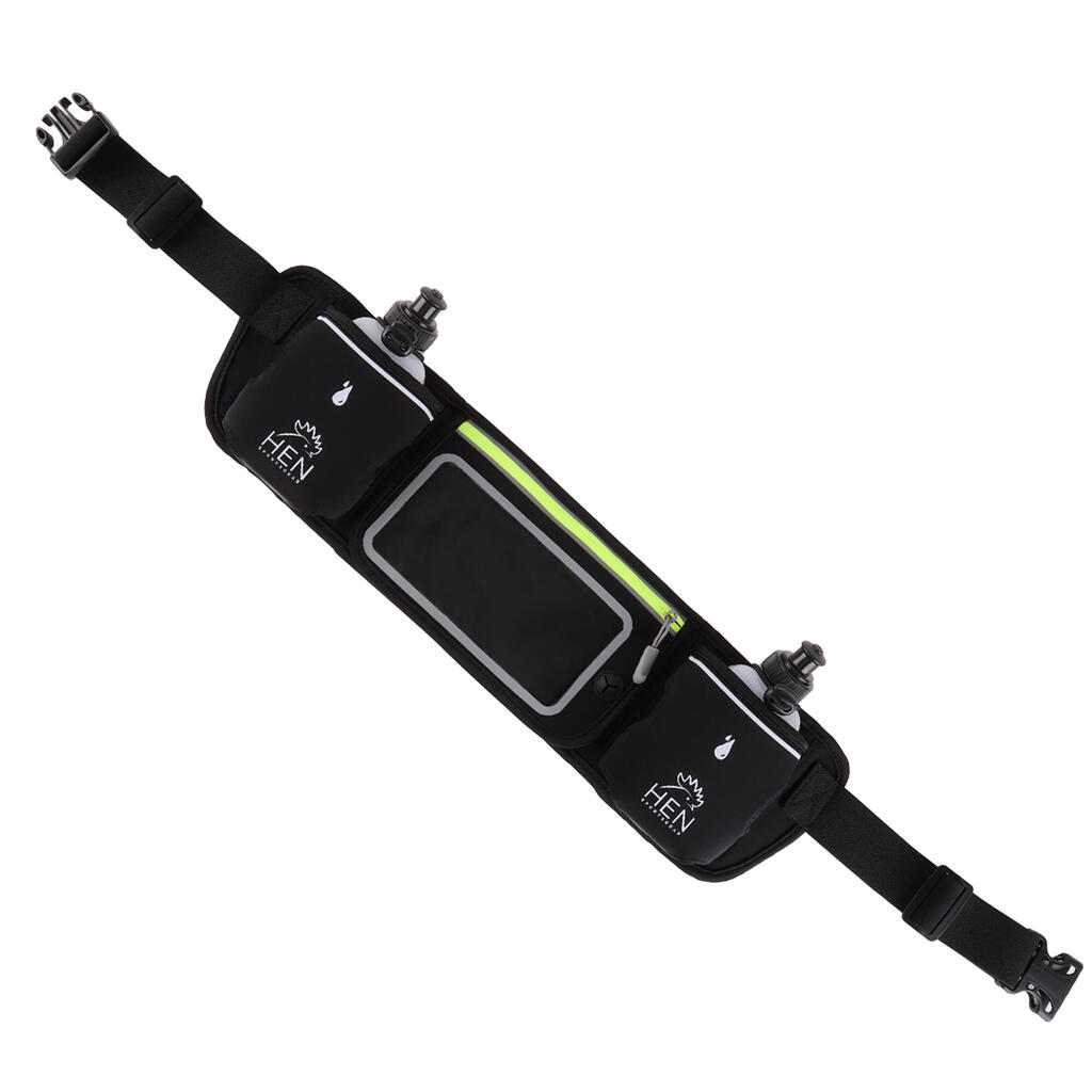 Hen Sportsgear sports waist bag with 2 water bottles: ideal for running, walking, or cycling. Water-repellent, adjustable, and with extra storage space for your phone and essentials.