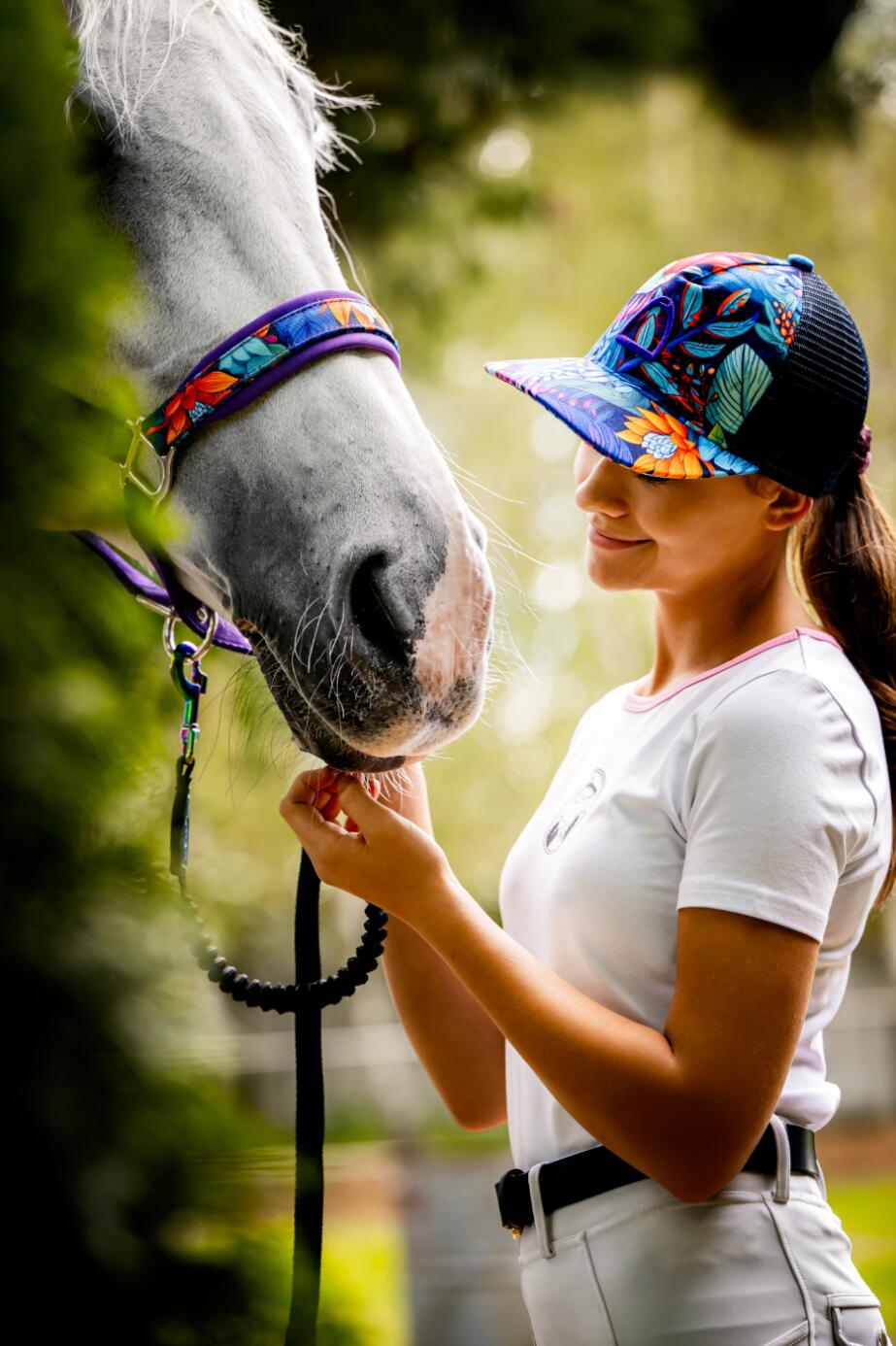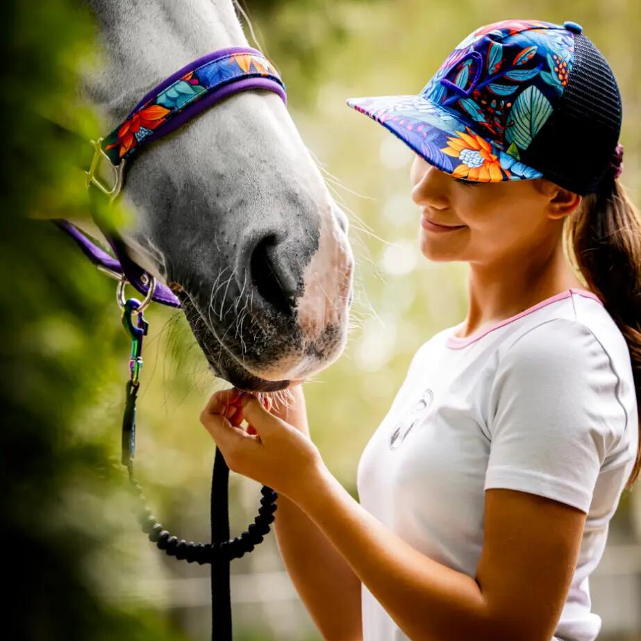 Stylish purple halter with a vibrant floral motif and soft neoprene padding. EU quality, fully adjustable, and unique Power Flower design.