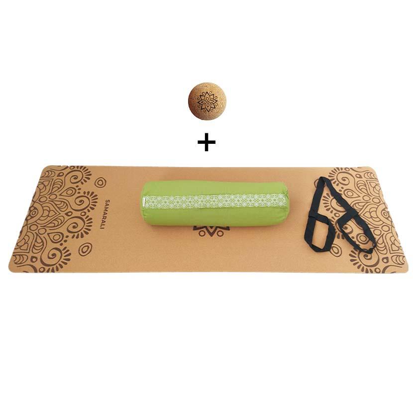 Experience ultimate comfort in your yin yoga practice with our complete kit, including a cork mat, bolster, yoga strap, and massage ball.