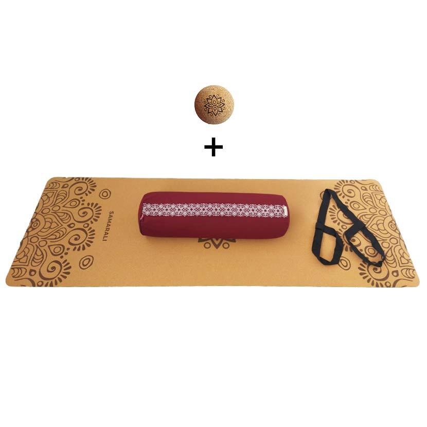 Experience ultimate comfort in your yin yoga practice with our complete kit, including a cork mat, bolster, yoga strap, and massage ball.
