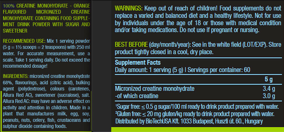 BiotechUSA 100% Creatine Monohydrate is a pure, micronized creatine that increases energy availability during intense workouts. Its high solubility and purity ensure optimal absorption.