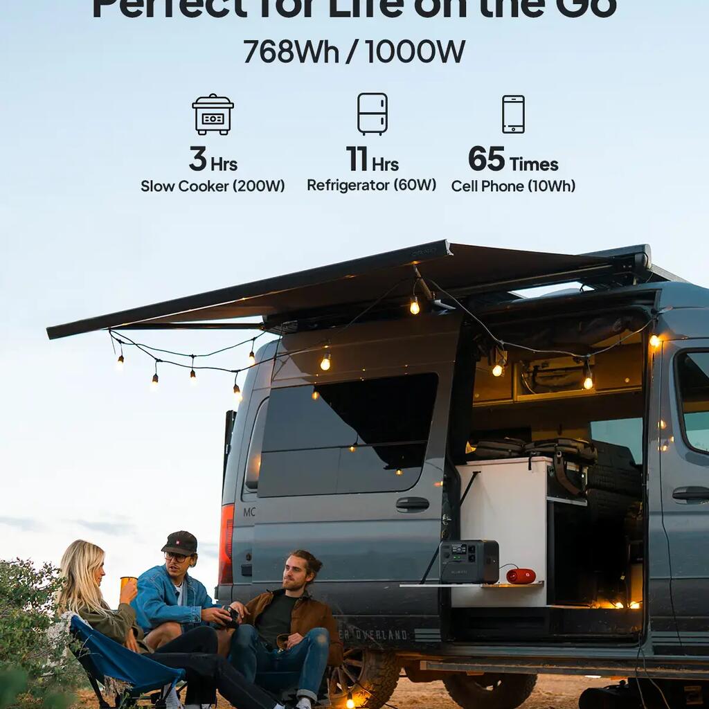 - Portable power capacity of 768 Wh – Ideal for camping, RV trips, and home emergency power supply