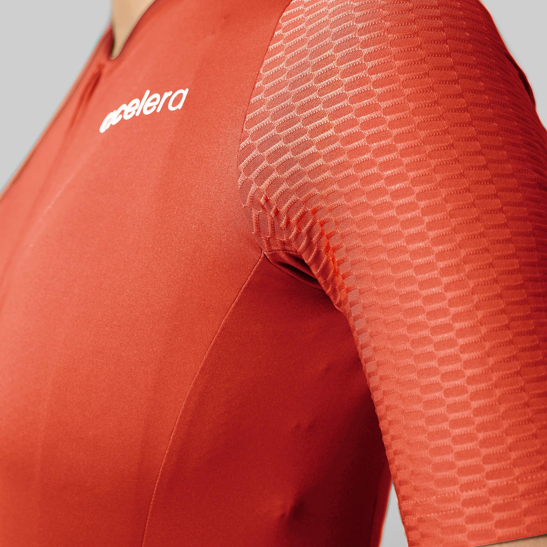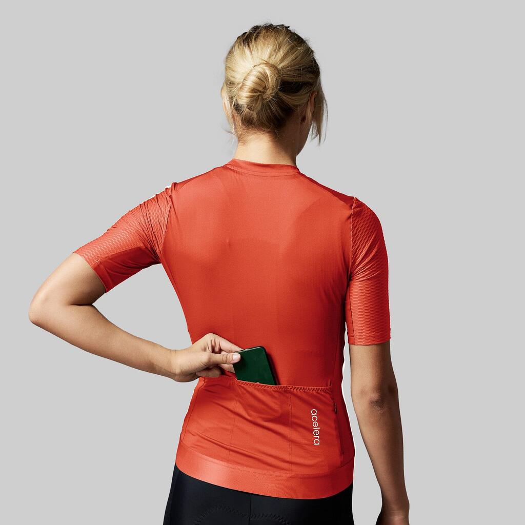 Breathable women's cycling shirt made from Italian fabric with aero sleeves and handy pockets on the back.