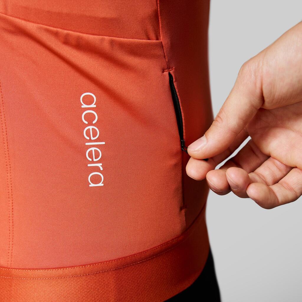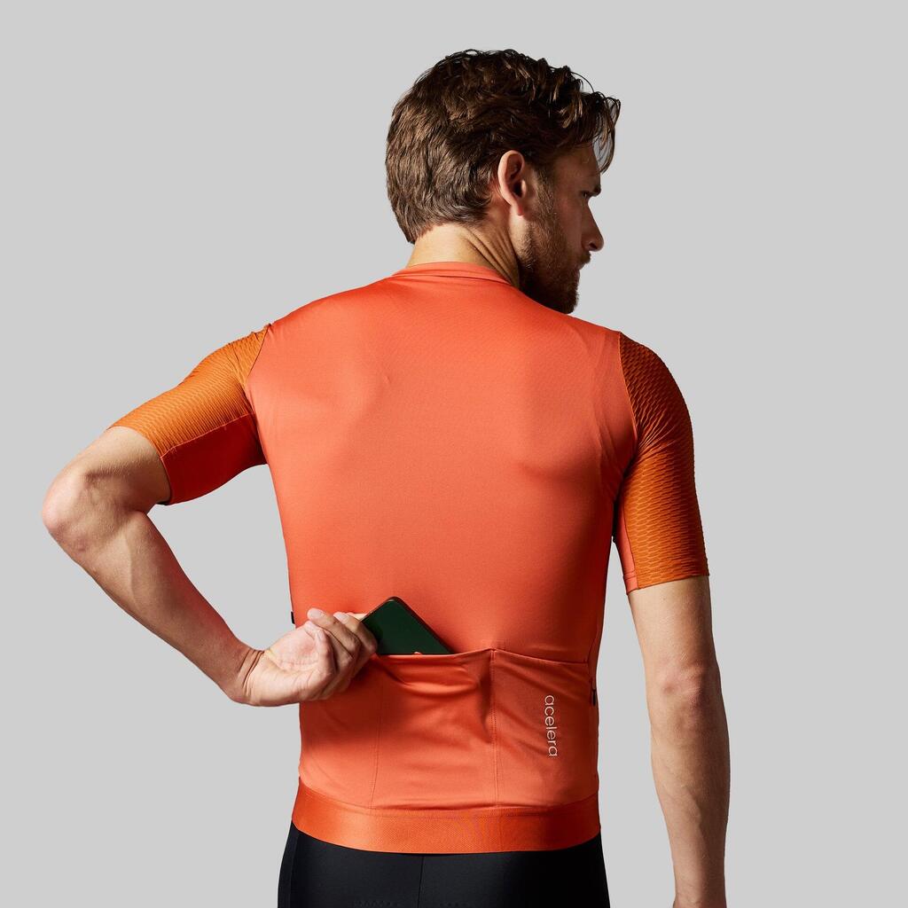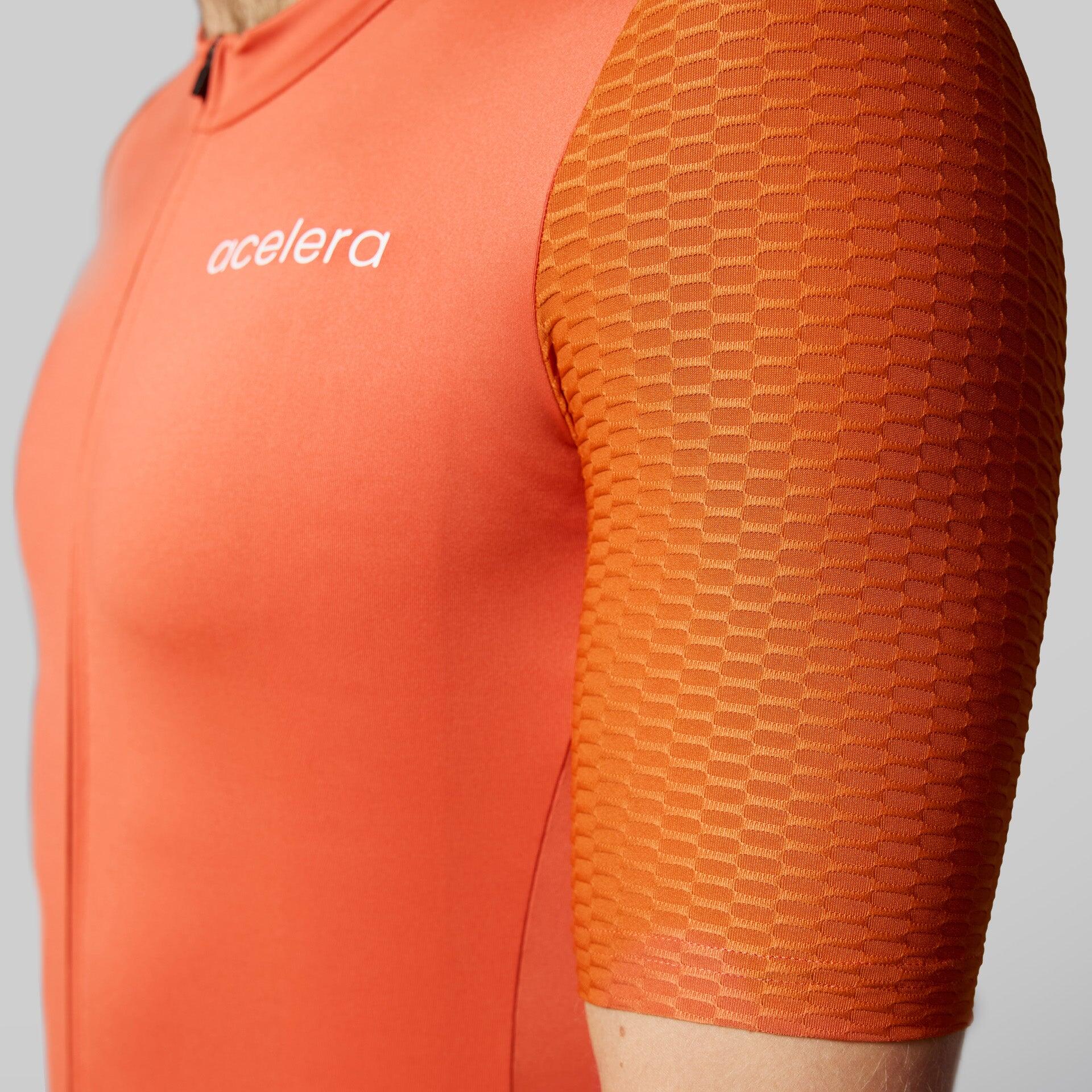 Breathable cycling shirt with aero sleeves, Italian fabric and handy zip pocket at the back.