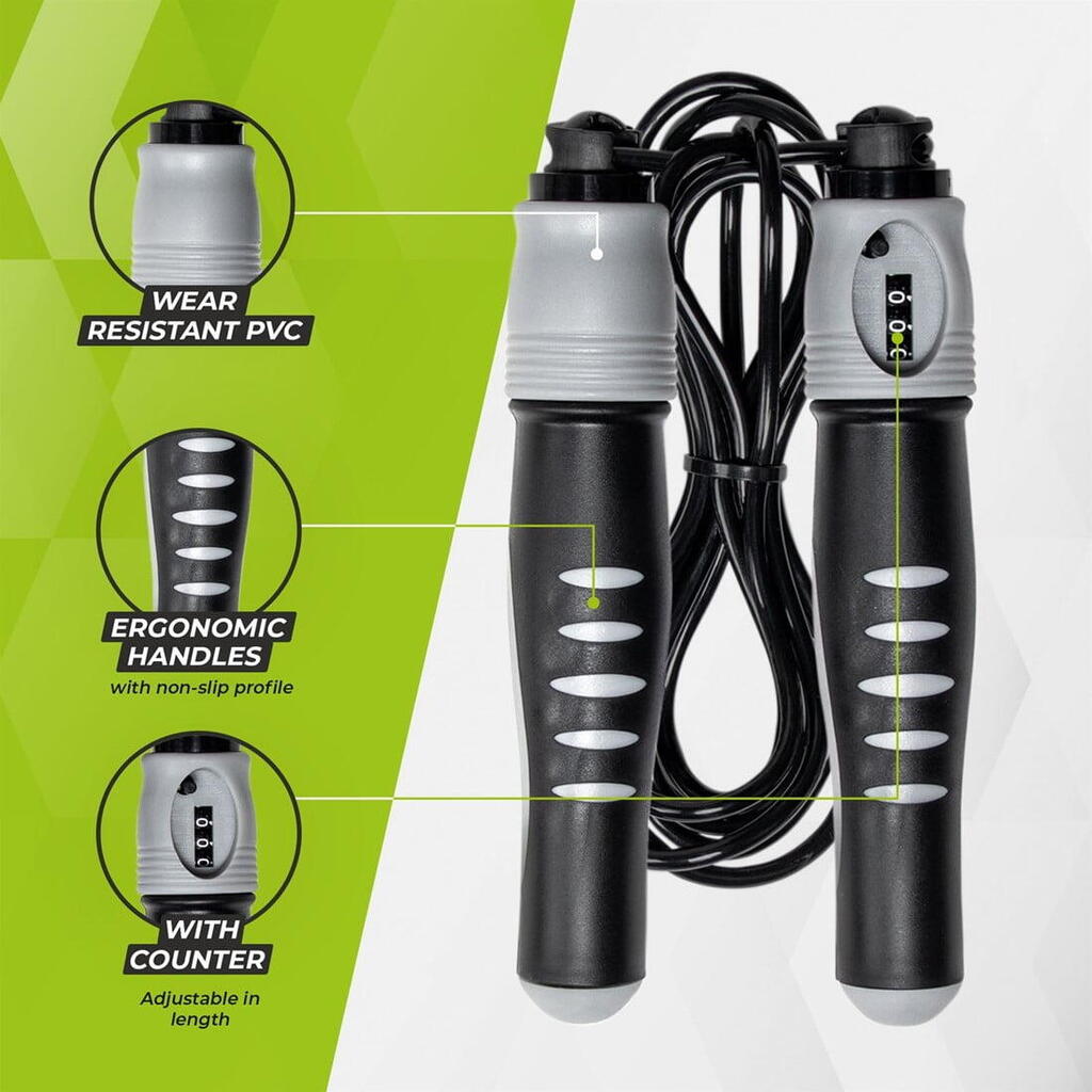 The VirtuFit Adjustable Jump Rope with Counter Black/Grey has plastic handles measuring 19.5 x 3.7 cm with an anti-slip profile. These handles fit well in the hand and feel comfortable. The length of the PVC rope is easy to adjust with an adjustment knob up to a maximum length of 280 cm. This makes this jump rope suitable for people of almost any height. During jumping, a counter keeps track of the number of jumps. This gives you an overview of your activity.