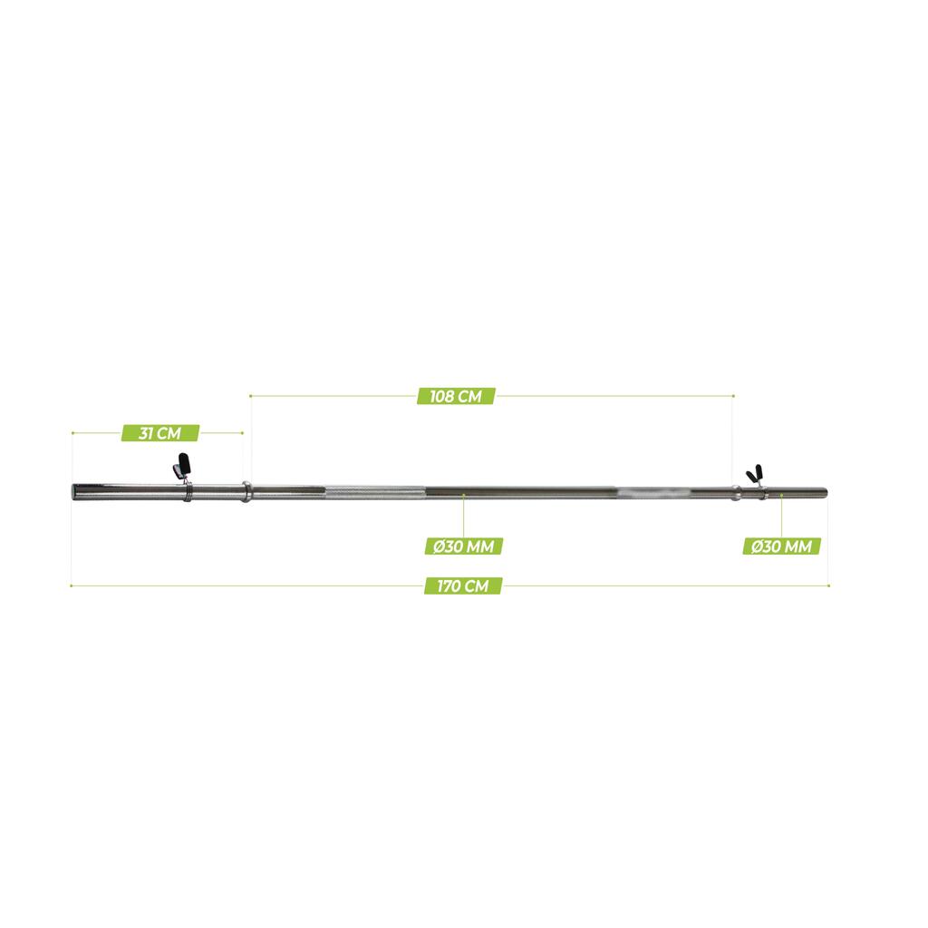 The VirtuFit barbell bar is 170 cm long and has an inner length of 105 cm.