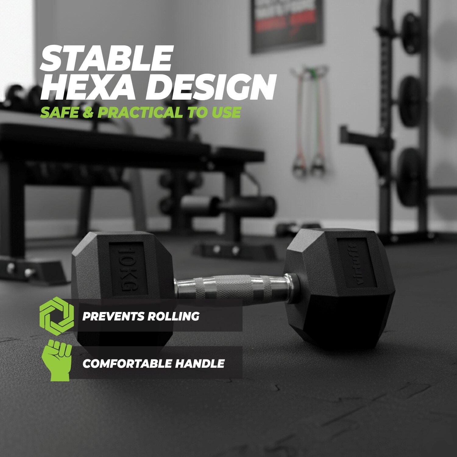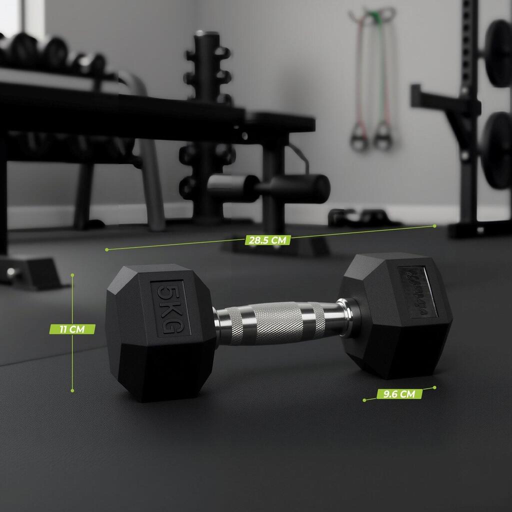 Quality hexagon dumbbell suitable for intensive use. Available in multiple weights. Sold per piece.