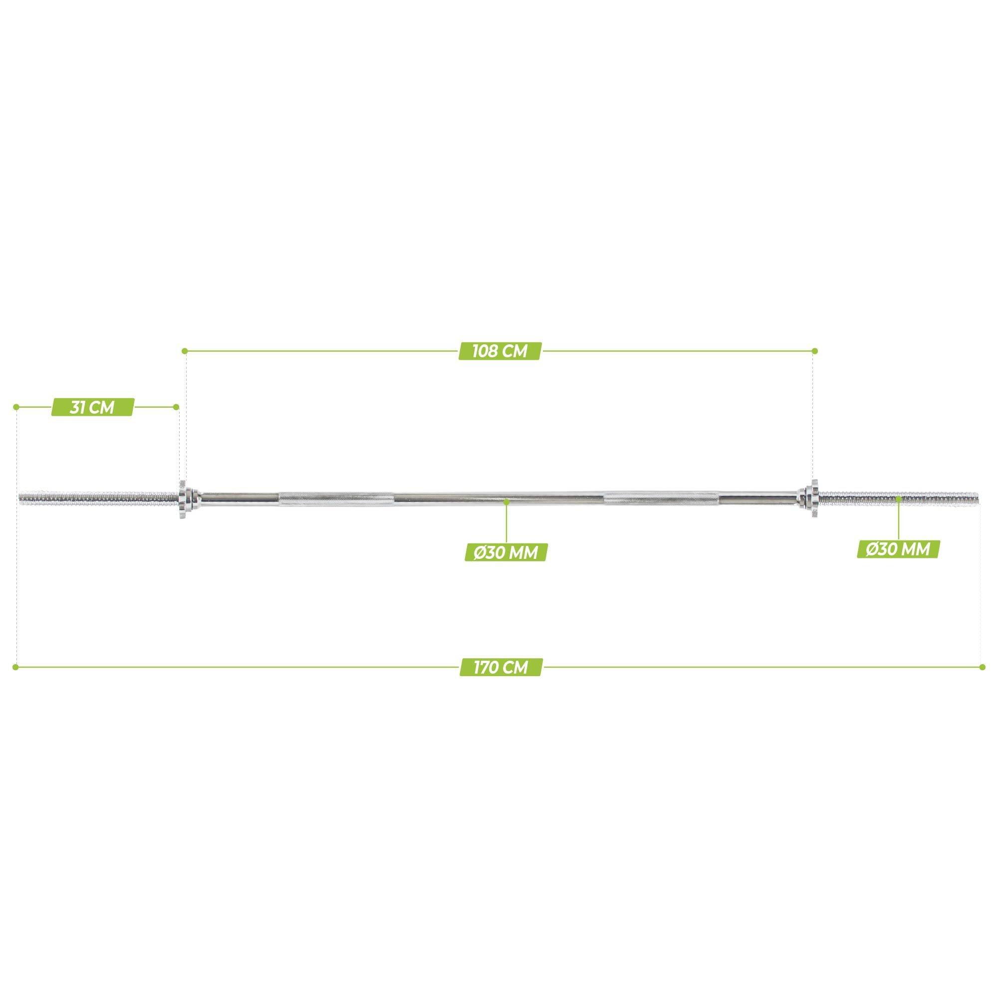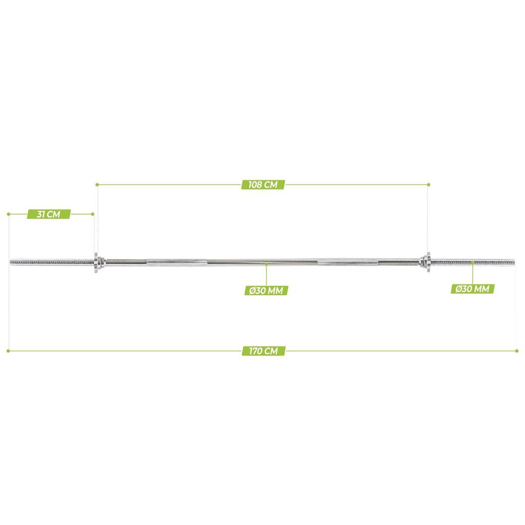 The VirtuFit Barbell Bar has a length of 170 cm and a diameter of 30 mm. The barbell bar is equipped with threading and extremely long 28 cm barbell plate sleeves, fitting many barbell plates! This allows you to determine your own training weight. The VirtuFit barbell bar has an inner length of 114 cm. With the screw collars, you can safely and easily secure the weights to the barbell bar.
