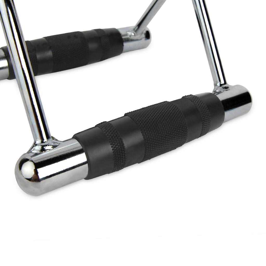 The VirtuFit Rowing Handle provides a different posture than a lat pulldown, resulting in targeted training of specific back muscles. The ergonomic handles fit comfortably in your hand and reduce pressure on your wrists during training. The anti-slip grips offer excellent hold, even during intensive exercises, allowing you to train safely and confidently. This rowing handle is easy to attach to any standard cable machine, enabling you to quickly and efficiently switch between various exercises.