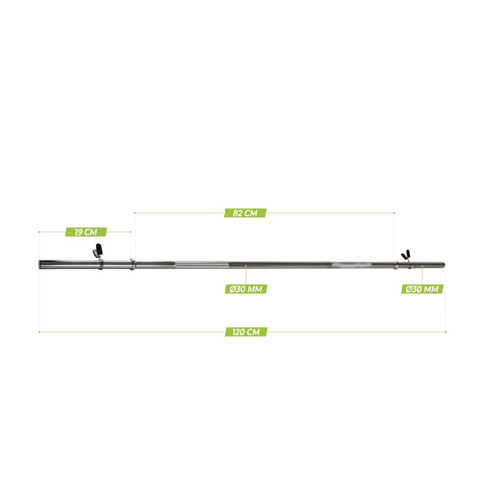 The VirtuFit Barbell Bar 120 cm spring clip 30 mm is of excellent quality and comes with a 2-year warranty. The middle section of this bar is 82 cm long with 19 cm on both sides. The bar weighs 5.6 kg and is loadable up to 150 kg.