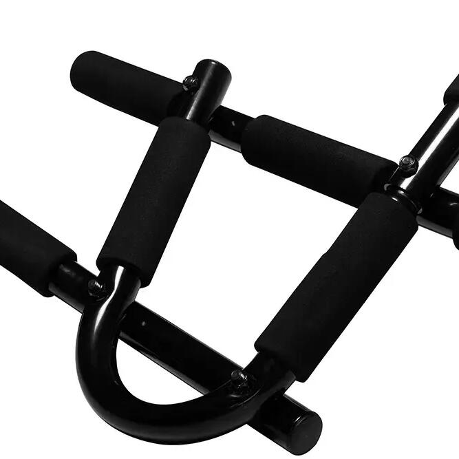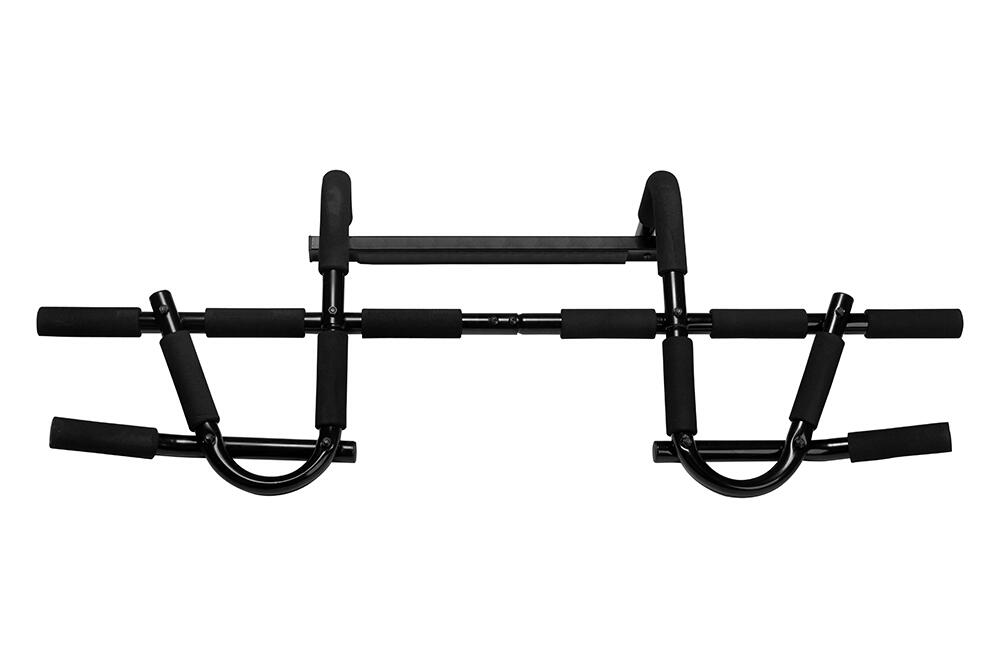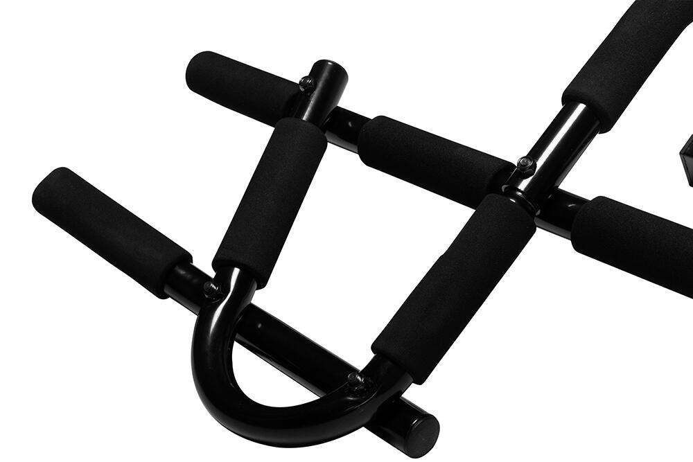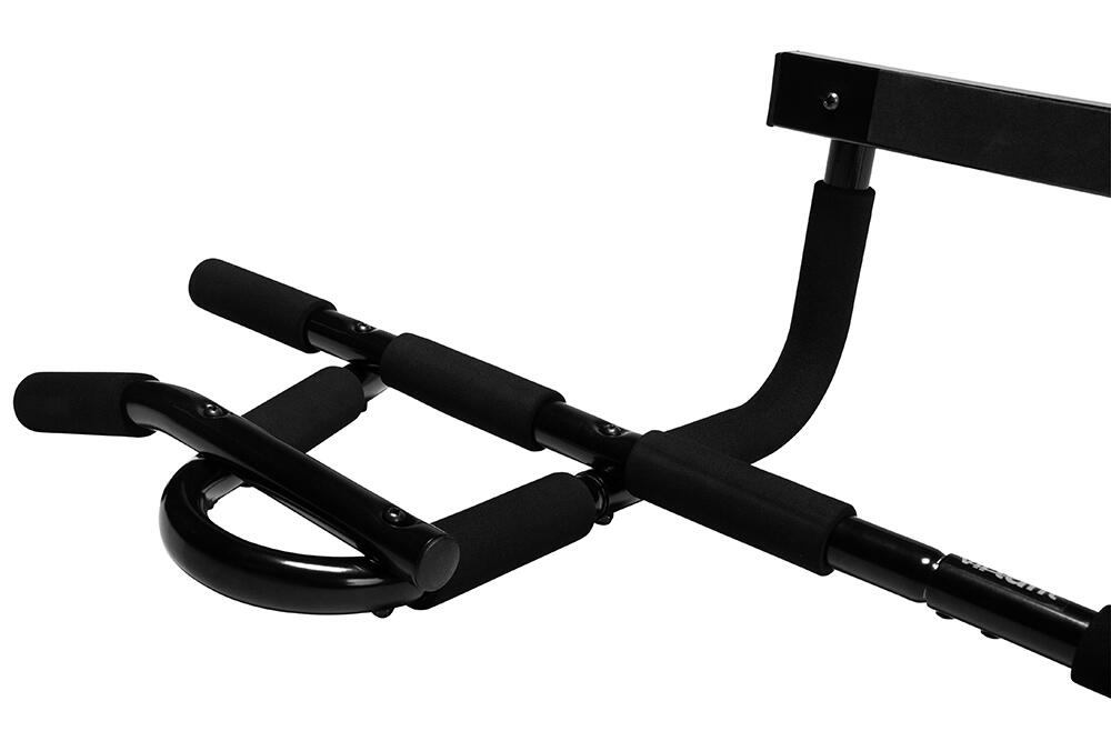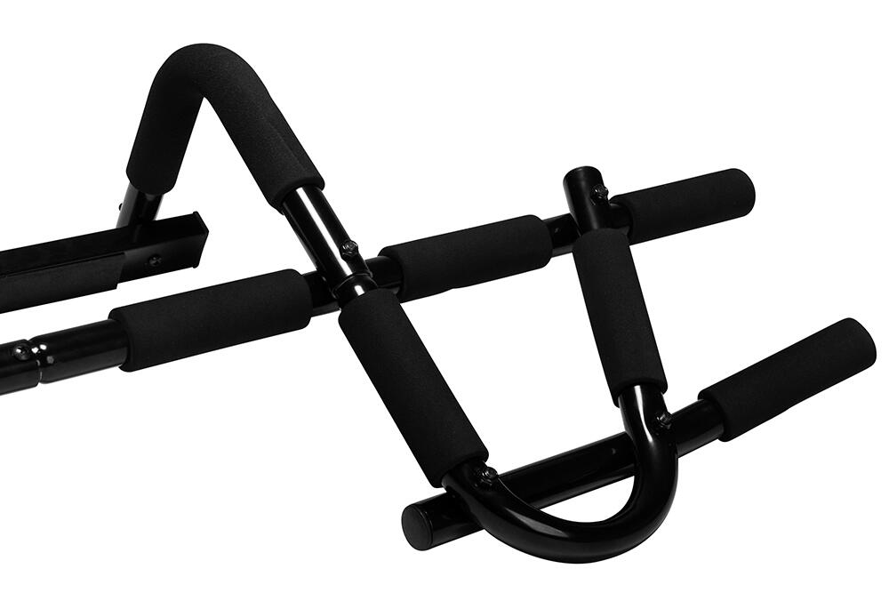 This multifunctional pull-up bar is not screwed in but clamped into the door frame, above the frame. The design of the bar ensures that a large part of the load is converted into horizontal pressure against the wall, so you are not hanging with your full weight on your door frame. Attaching and removing takes only a few seconds.