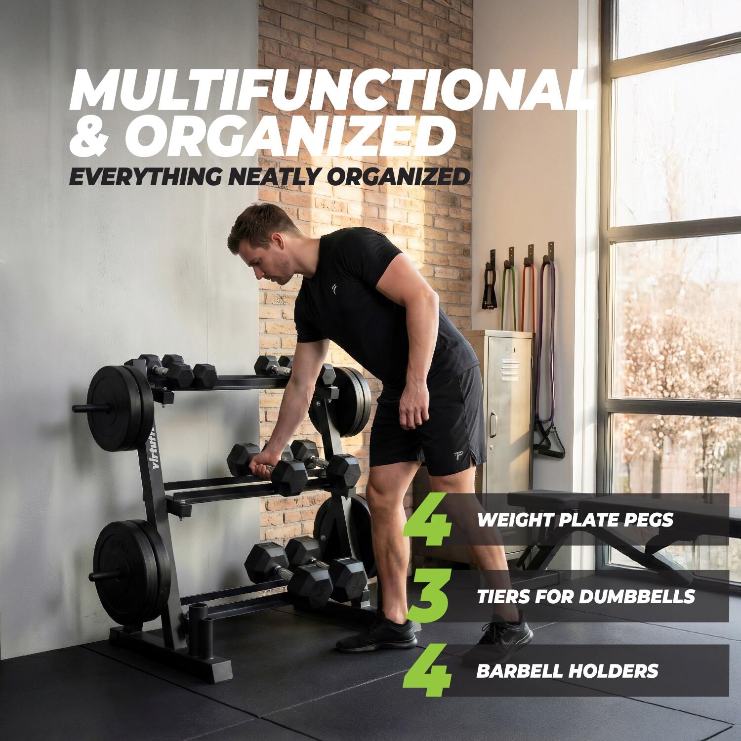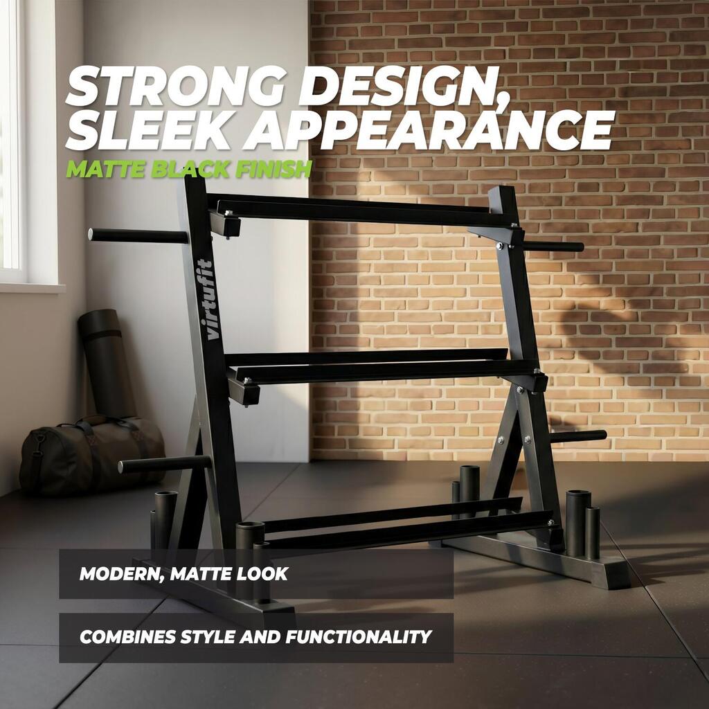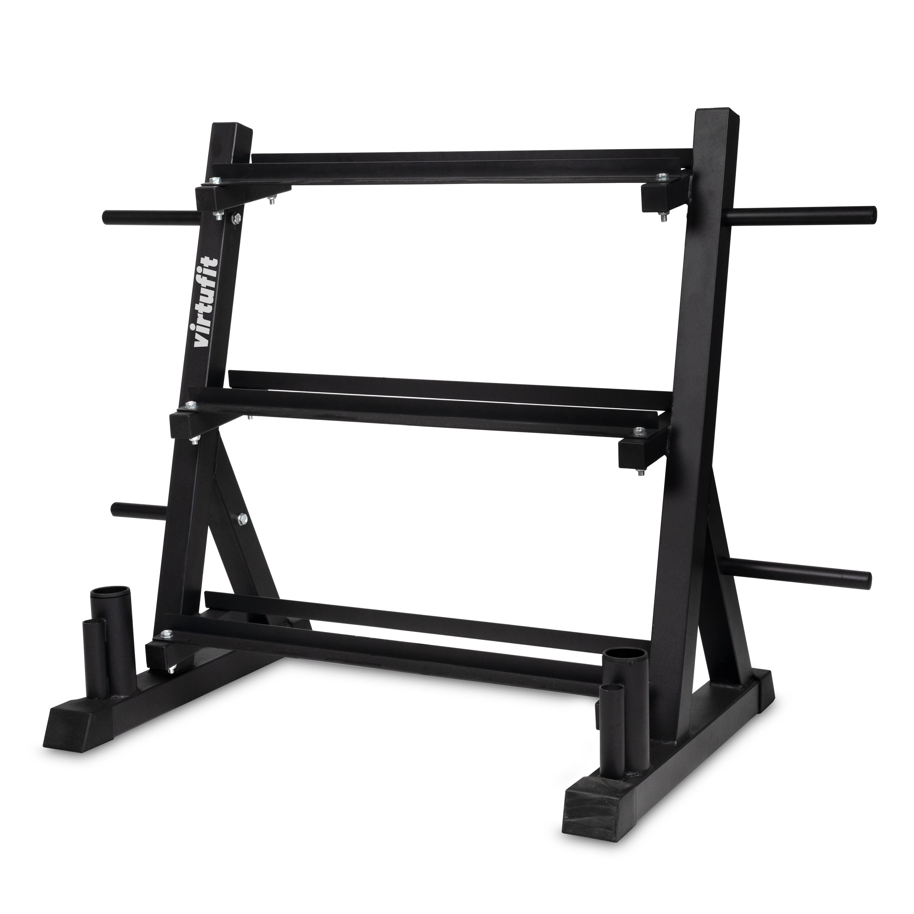 Keep your training space neat and organized with the VirtuFit Multifunctional Storage Rack. This versatile rack offers a complete solution for storing weight plates, bars, and dumbbells. The compact and sturdy design makes it ideal for home use and helps you make the most of your fitness space.
