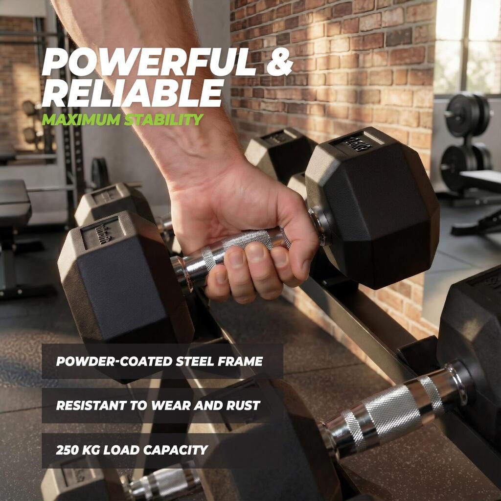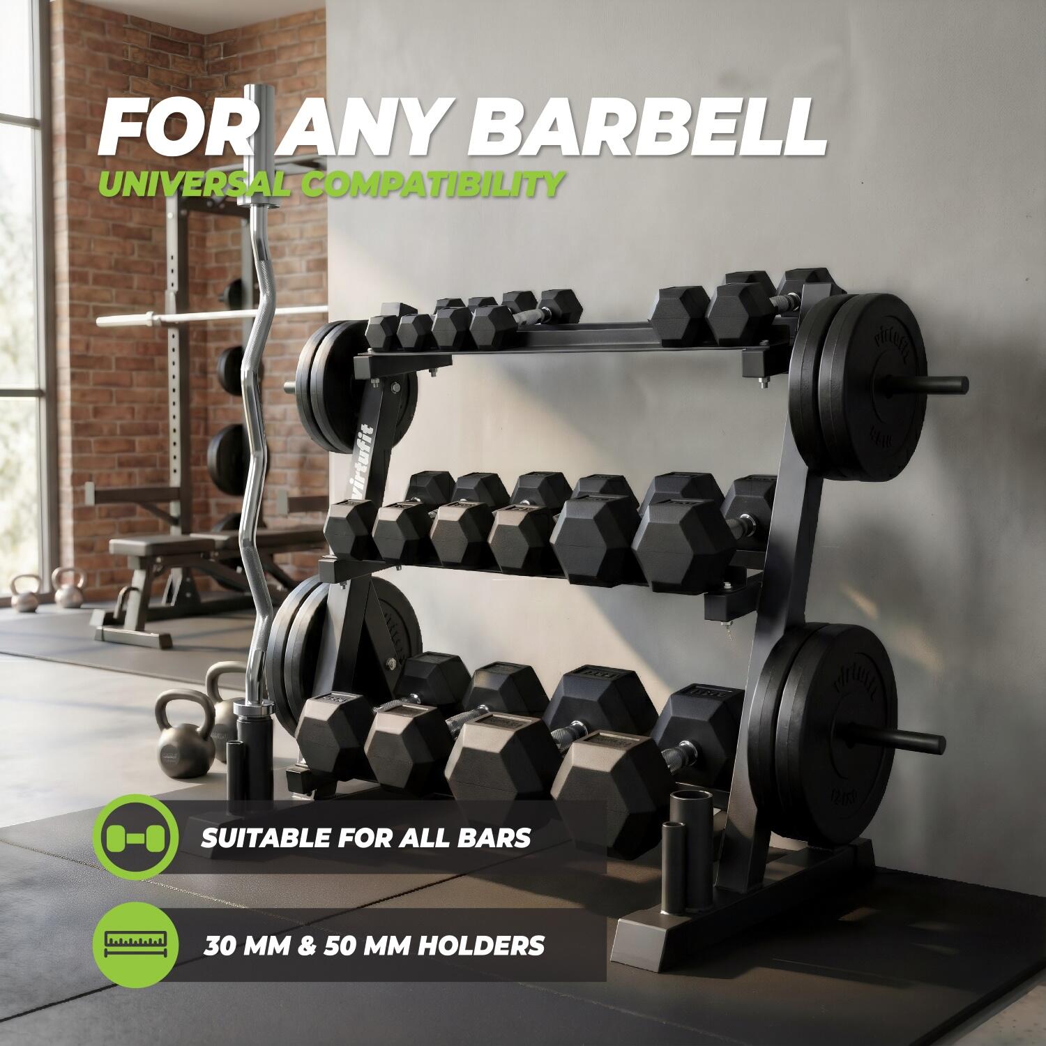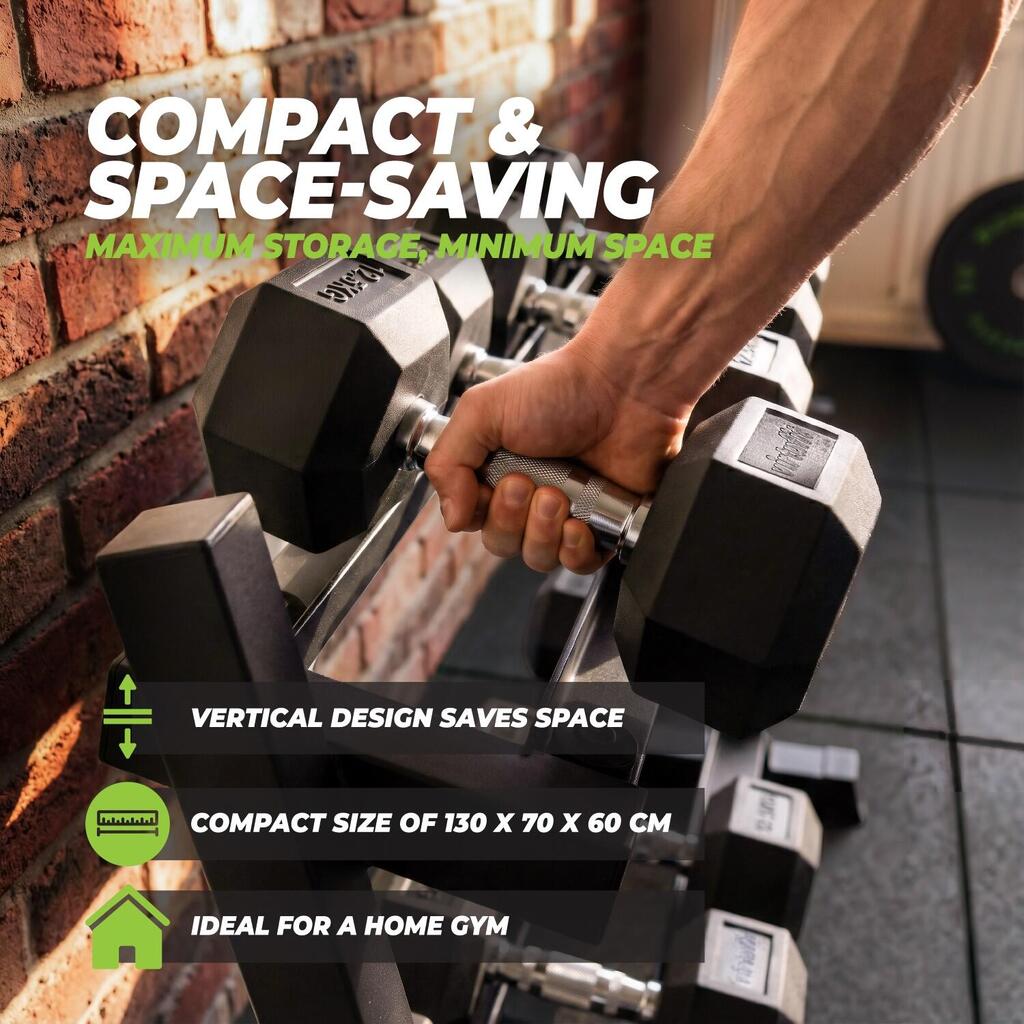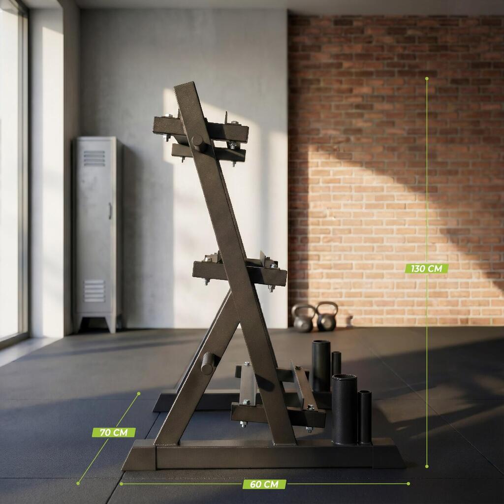 The VirtuFit Multifunctional Storage Rack helps you keep your training area tidy and efficient. The three spacious tiers provide plenty of room for dumbbells, while the four plate holders on the sides allow for safe and organized storage of weight plates. Additionally, the bar holders are suitable for both Olympic bars (50 mm) and standard bars (30 mm). This versatile storage rack is the ideal complement to VirtuFit products such as weight plates, bars, and dumbbells.