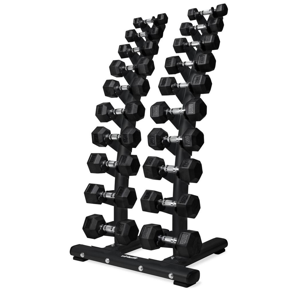 The VirtuFit Dumbbell Rack Standing Deluxe Barbell Rack is a very beautifully designed rack that can hold 20 dumbbells or 10 dumbbell sets. With this rack, you can not only easily store your dumbbells, but it also gives your fitness space a sleek appearance. This rack also ensures that your space remains organized, clean, and safe. The rubber finish prevents this dumbbell rack from damaging your dumbbells. The VirtuFit Dumbbell Rack Standing Deluxe can hold 20 dumbbells or 10 dumbbell sets and measures 84 x 61 x 131 cm (l x w x h).