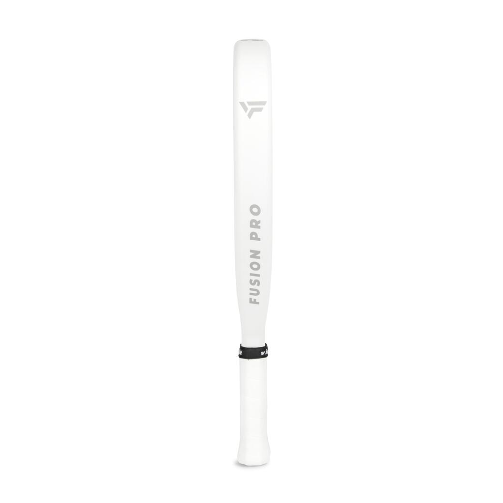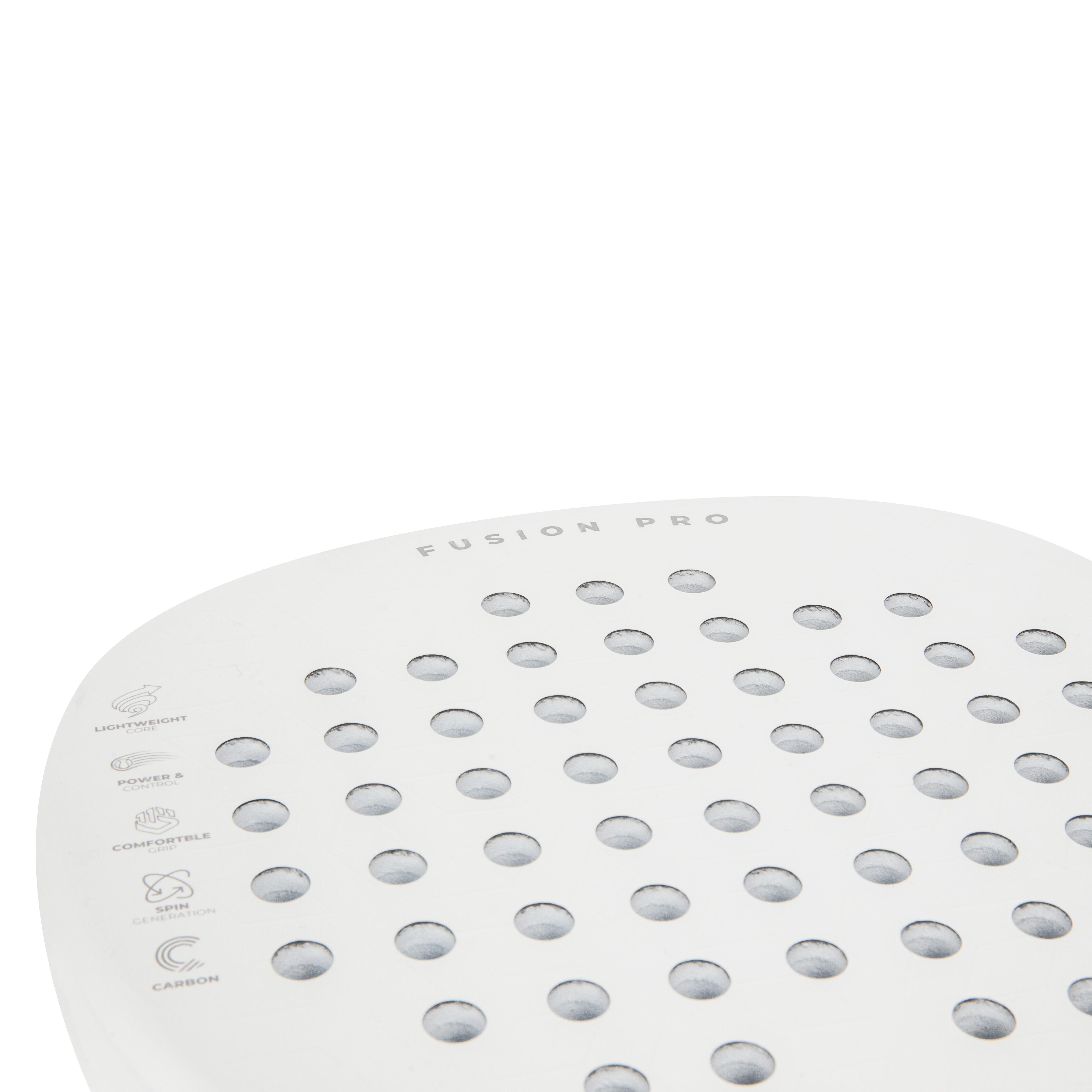 The centrally and high placed balance point of the Fusion Pro offers optimal control and hitting power. The teardrop-shaped face has a smaller sweet spot than round rackets, requiring more precision in your hits. By using high-quality 18K Carbon Fiber, this racket is exceptionally stiff and powerful, allowing every shot to be hit with a lot of speed and spin. The 38mm frame thickness provides extra stability and durability, while the hard core of EVA Foam offers optimal shock absorption and control.