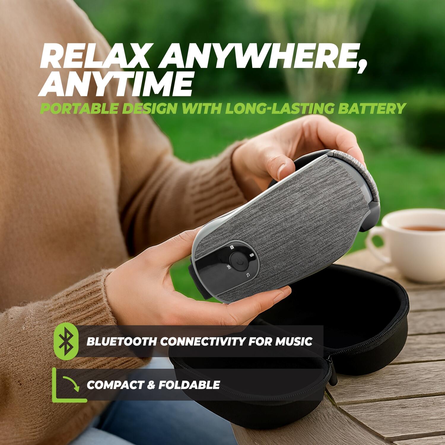 Thanks to the wireless and foldable design, you can take the VirtuFit Eye Massager with you everywhere. The durable battery lasts up to 2 hours after a single charge, allowing you to enjoy a relaxing massage multiple times a day. The VirtuFit Eye Massager can be fully charged in 2 hours, meaning you can quickly enjoy a refreshing massage session again. Bluetooth connectivity allows you to play your favorite music or soothing sounds, contributing to deep relaxation, ideal for both home use and on the go.