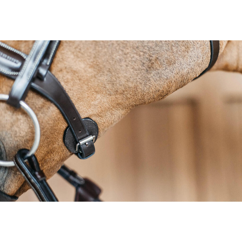 This bridle is equipped with a removable ½'' flash. The round leather is thin and light for ultimate comfort. The horse's ear movements are free. The horse has a free champ of vision because the buckles of the uprights are below eye level.