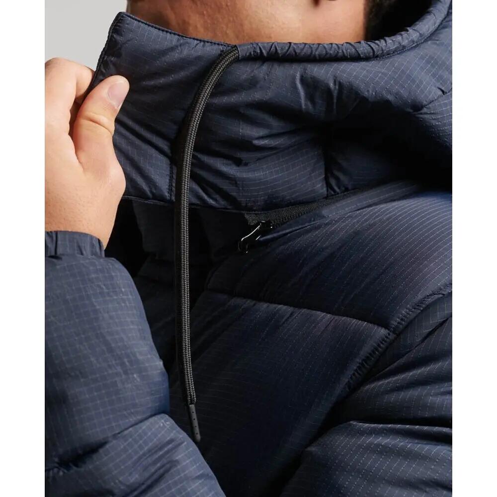 - Removable quilted hood with drawcord
