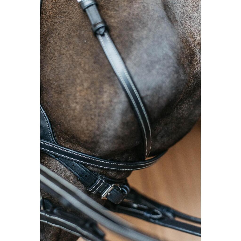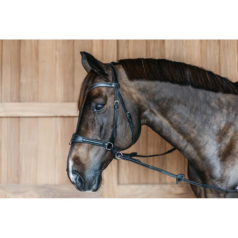 The bridle features a removable flash ½'' and includes two cross pull straps, making it adjustable to your needs and allowing five different ways of using it. To optimize your horse's champ from vision, the uprights are positioned below eye level.