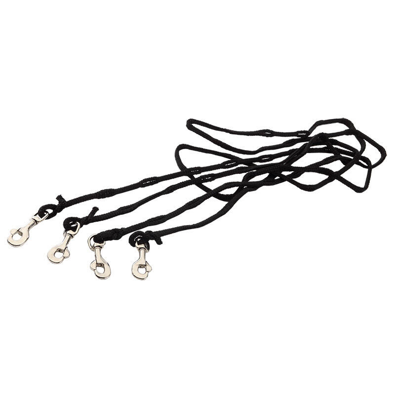 The Philips reins are two individual belts, which are turned in the same way as running reins the girth through the snaffle rings to the horse. Instead, under the horse's fuselage, they are however attached to the horse's side, which results in better lateral guidance of the horse compared to running reins. They are used for riding and lunging, but are also ideal for working with young horses. The Philip reins are ideal for professional lunging. The horse's freedom of movement can vary depending on whether the triangle is increased or decreased. The further apart the leather straps are, the larger the lateral triangle and the horse has more room to move up and down. In addition, a wide buckle provides good lateral stability and allows horses that like with the outside shoulder to dodge a frame to the outside. Each rider or sparer can also connect the Philips reins so that they are as stiff and use as normal side reins as a direct and constant support. Philip reins, which are for each level of teaching, just on the lunge, very suitable. They allow to cover many points of the schooling scale and are very versatile.