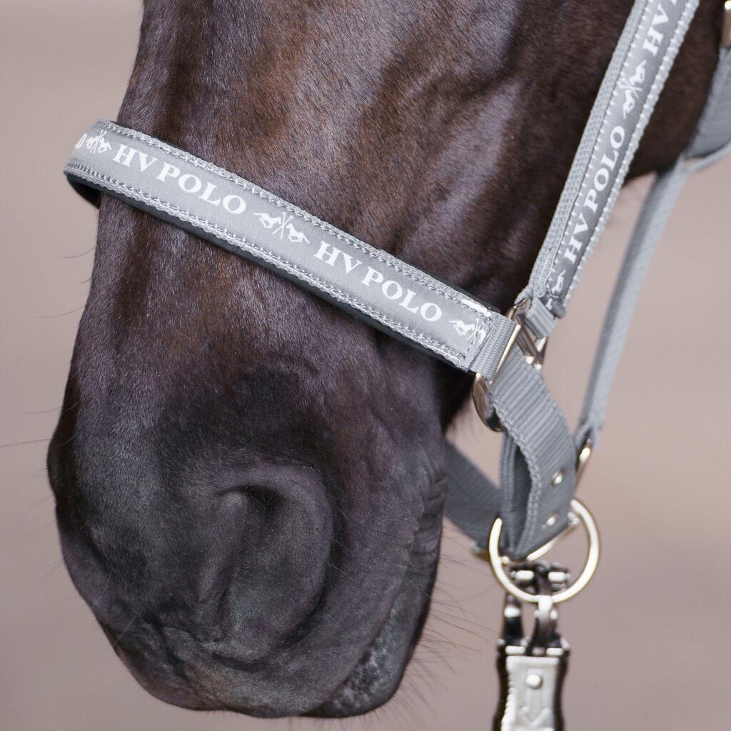 Basis halster met merklogotape op de bakstukken en op de neusriem . Zachte neopreen vulling onder het kopstuk en de neusriem. Kopstuk en neusriem zijn in maat verstelbaar