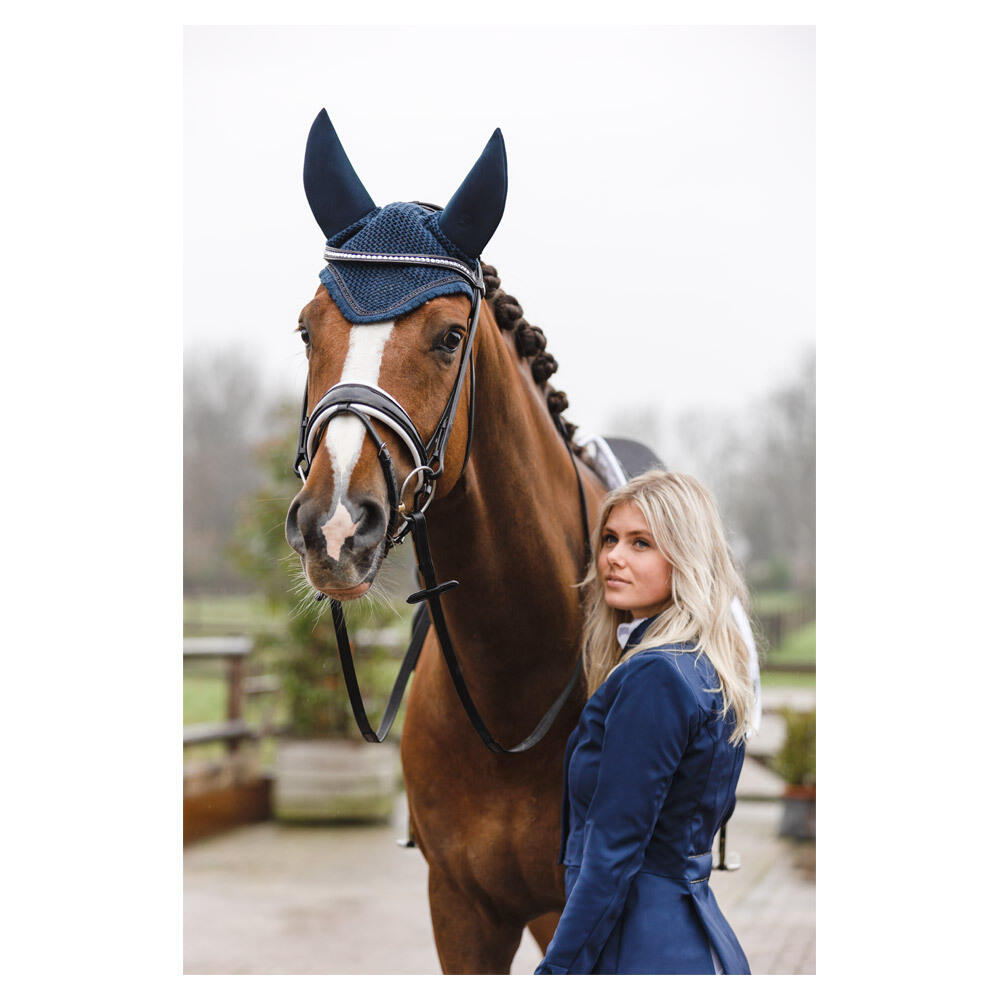 Give your horse the gift of calm and elegance with the ANKY Charm bonnet in noise-reducing neoprene and crocheted cotton, adorned with rhinestones and twisted cords.