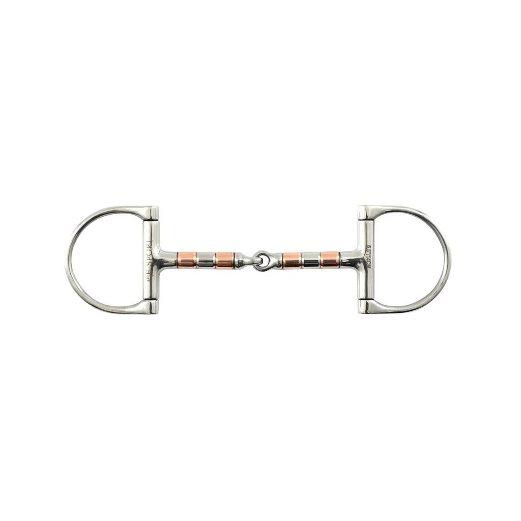 The copper roller mouthpiece is useful for horses that tend to stare at the bit or try to grab or lean on it. Alternating copper and stainless steel rollers along the mouthpiece allow the bit to move in the horse's mouth, preventing him from grabbing or leaning on the bit. The single jointed mouthpiece has a nutcracker action applying pressure to the lips and bars of the mouth. Ring cheeks can help direct the horse, pressing on the aids when the rider requests a turn.