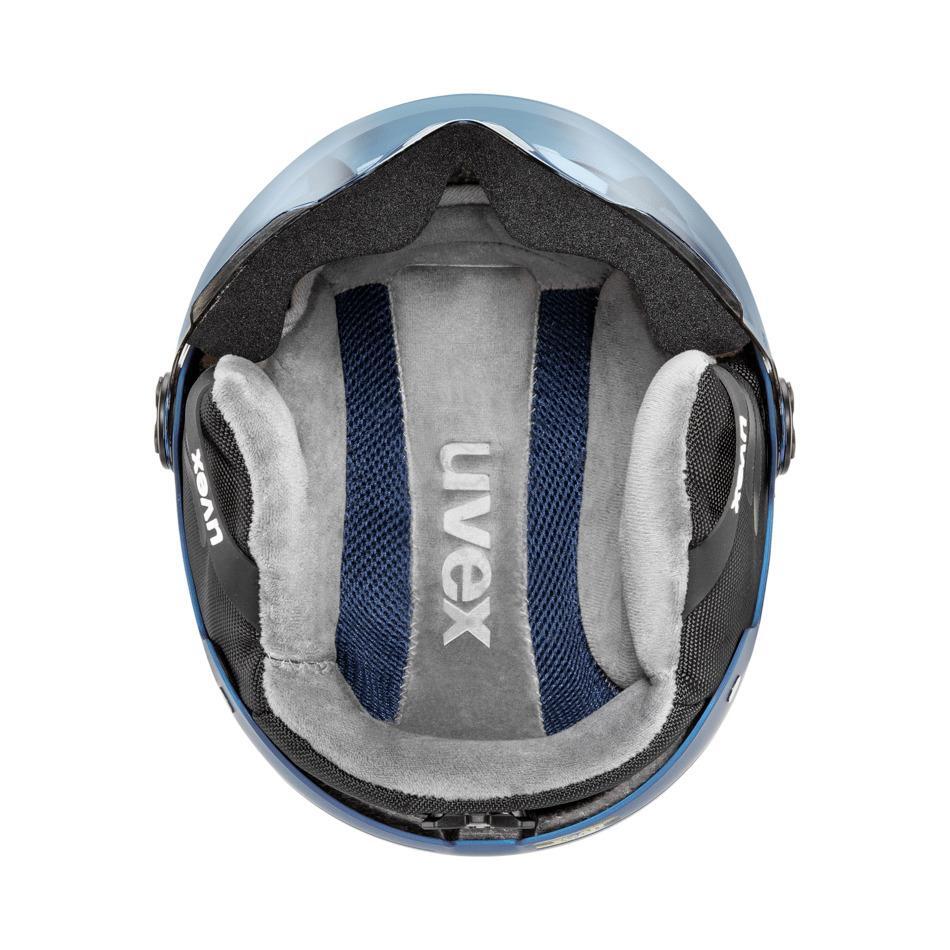 Calling all youth: the new uvex rocket jr. visor with a sleek design is made for big snowy days. Its innovative hardshell construction offers uncompromising protection - the robust outer shell is impact-resistant, the inner EPS shell absorbs shocks and adds extra insulation. To help you keep your cool, even on the wildest slopes, the passive ventilation system allows fresh air to constantly flow into the helmet. Forget about goggles! The large slightly mirrored visor with lasergold lite tint enhances contrast, and the anti-fog coating uvex supravision® ensures perfect vision. The helmet features soft padding and an additional neck gaiter for optimal comfort.