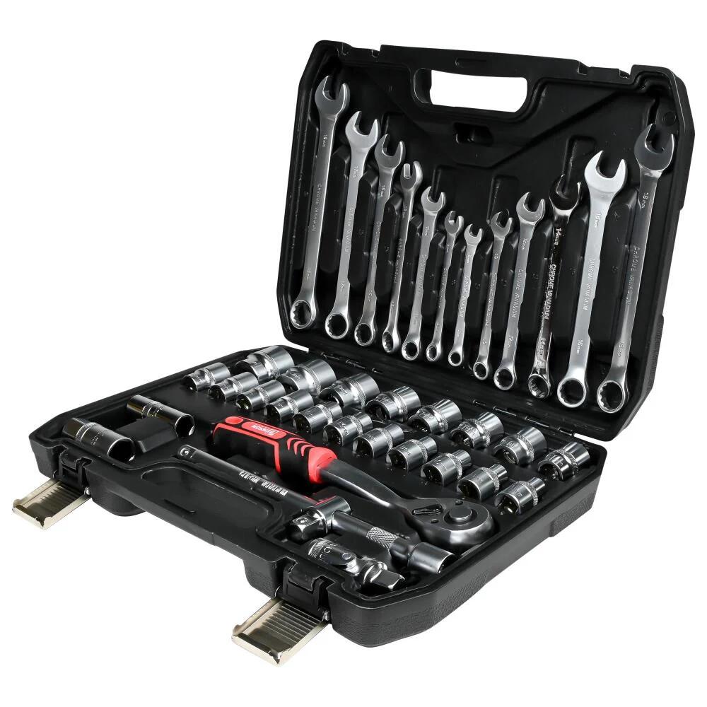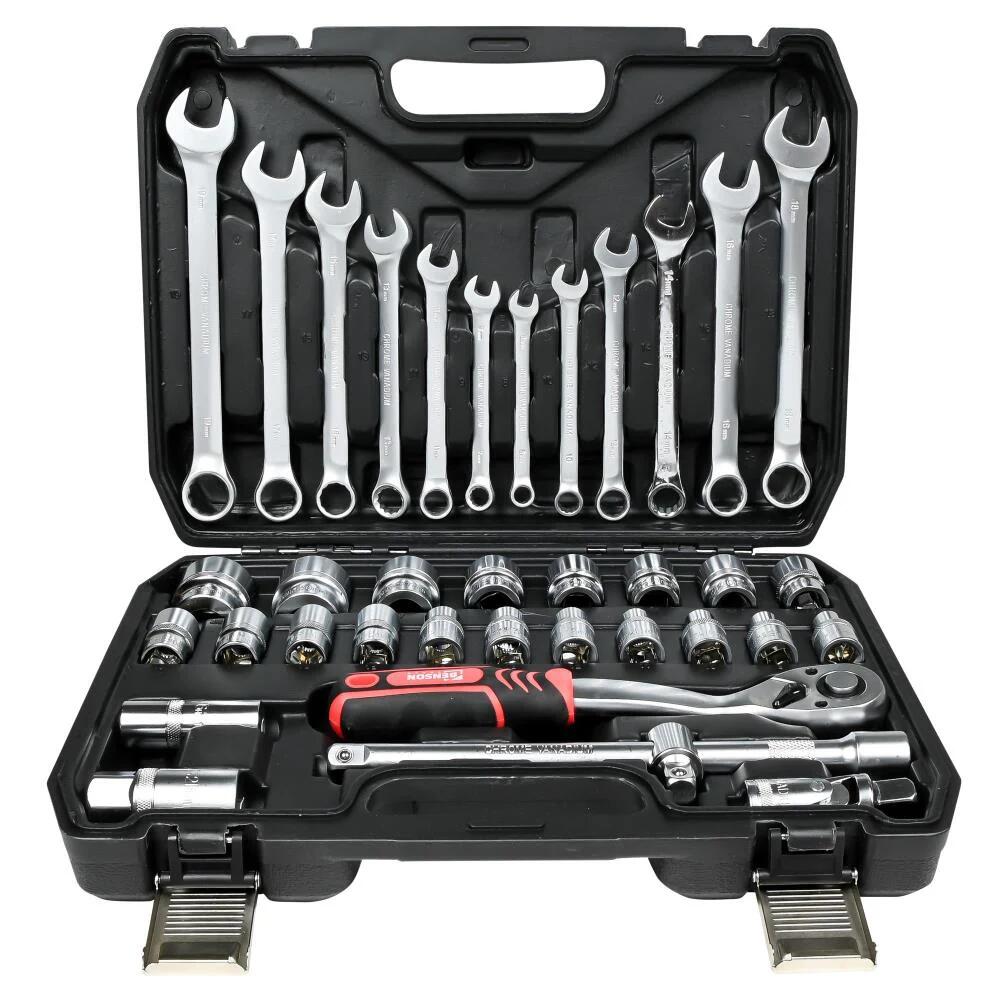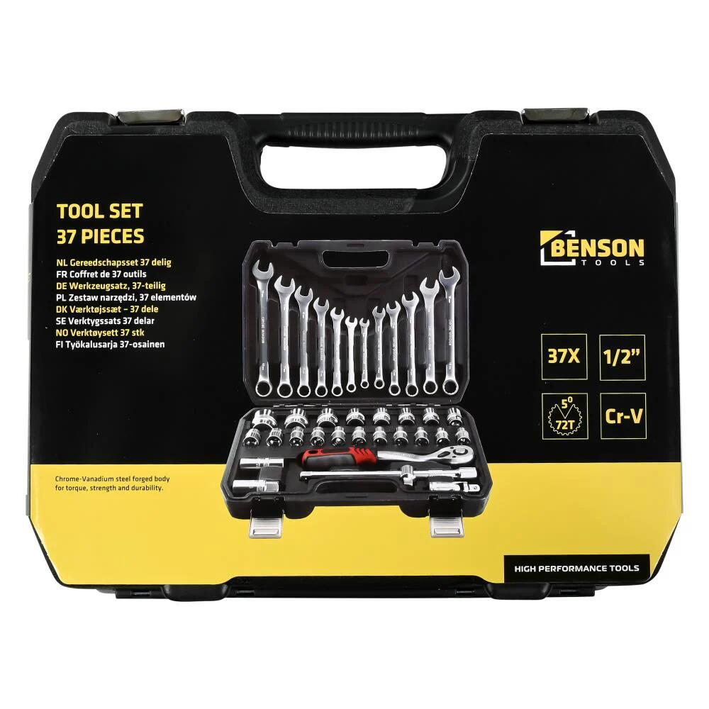 The set contains a **wide selection of 1/2" sockets from 8 mm to 32 mm, combined with 12 combination wrenches** for extra flexibility. The **72-tooth ratchet** ensures smooth and accurate work, even when space is limited.