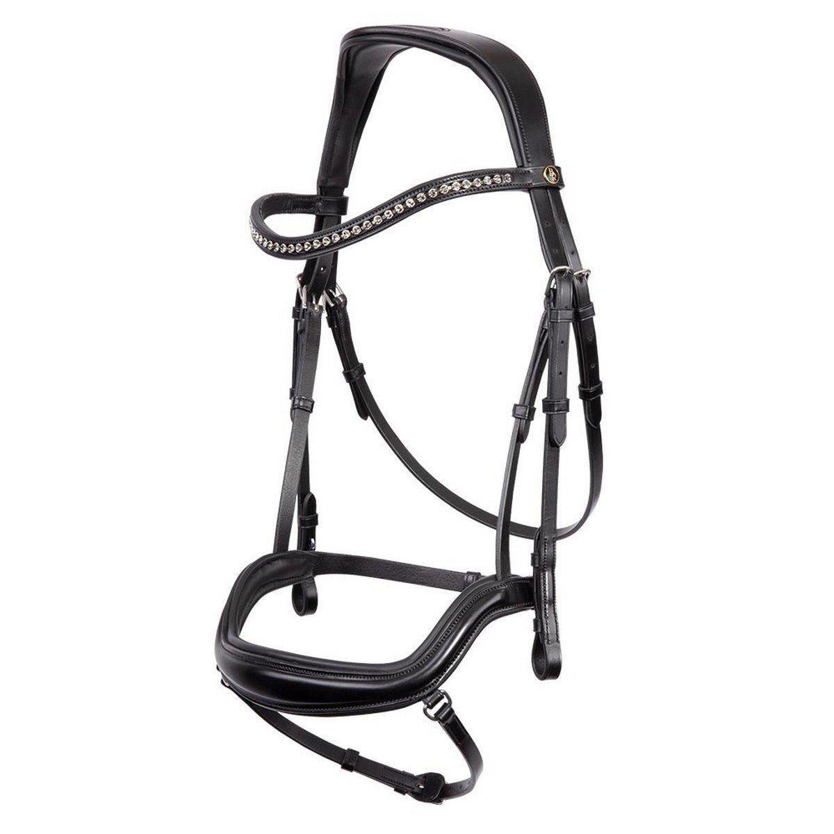 The BR Stanley bridle features a soft, extra-wide headpiece, a uniquely shaped noseband and soft, supple leather. The extra-wide Anatomic Fit headpiece is anatomically shaped and has a soft lining. This ensures a good fit, better pressure distribution on the horse's head and great comfort. The combined German noseband is rounded and has a thick, comfortable lining. The noseband combines the action of the German noseband with the pressure distribution of a combined English noseband. The bridle is made of soft, supple leather that adapts perfectly to the horse's head. The leather is of good quality and retains its good looks for a long time. The slightly rounded BR Vosges browband is embellished with a chain of two-tone Black Diamond Stellux™ luxury crystals and lined with leather. The crystals are fully set so that they are securely attached. The bridle features shiny silver trim in chrome-plated brass.