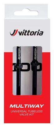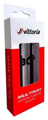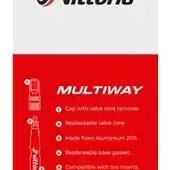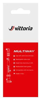 Vittoria Multiway tubeless valves are made of premium aluminum for optimum durability and lightness.The alloy cap features a valve core extraction tool for quick and easy application.Multiway valves are compatible with highly concentrated particle preventids as well as tire foams, making them the must-have valves for the best tubeless tire and rim mounting.Available in 40 mm, 60 mm, 80 mm and 100 mm, Vittoria Multiway valves are suitable for all types of rim depth, for road and mountain bike wheels.Valve seal and shell are replaceable for extended product use.Details Set of 2 valves. Ultra-light. Alloy caps with shell removal tool. Compatible with high particle concentration preventatives and tire foams. Made from premium aluminum. Removable shell for easy injection of preventive fluid. Weight : 5 g