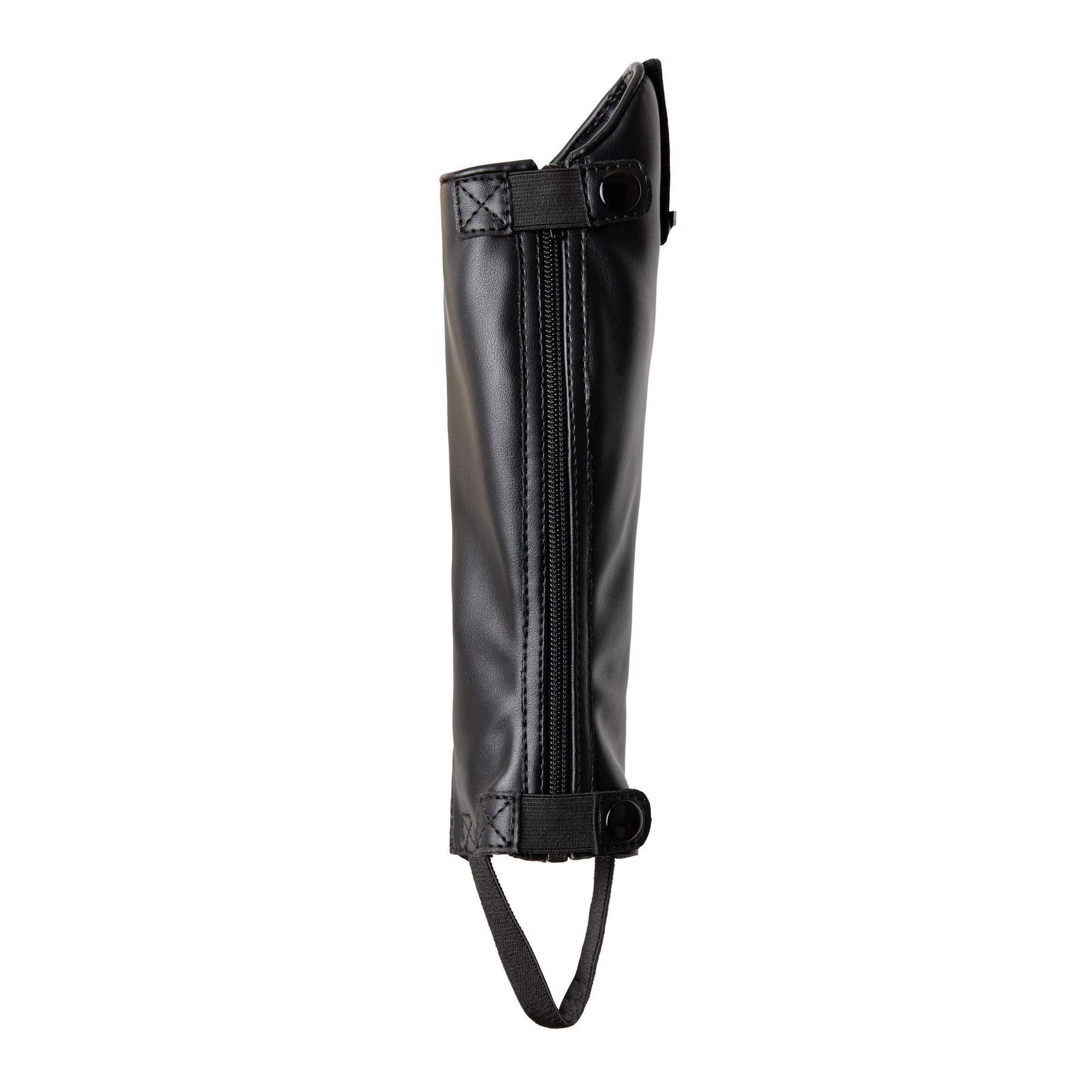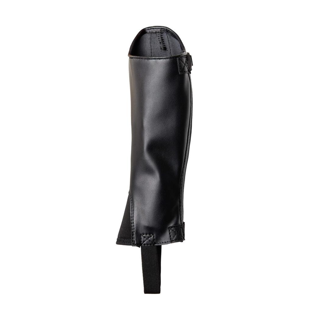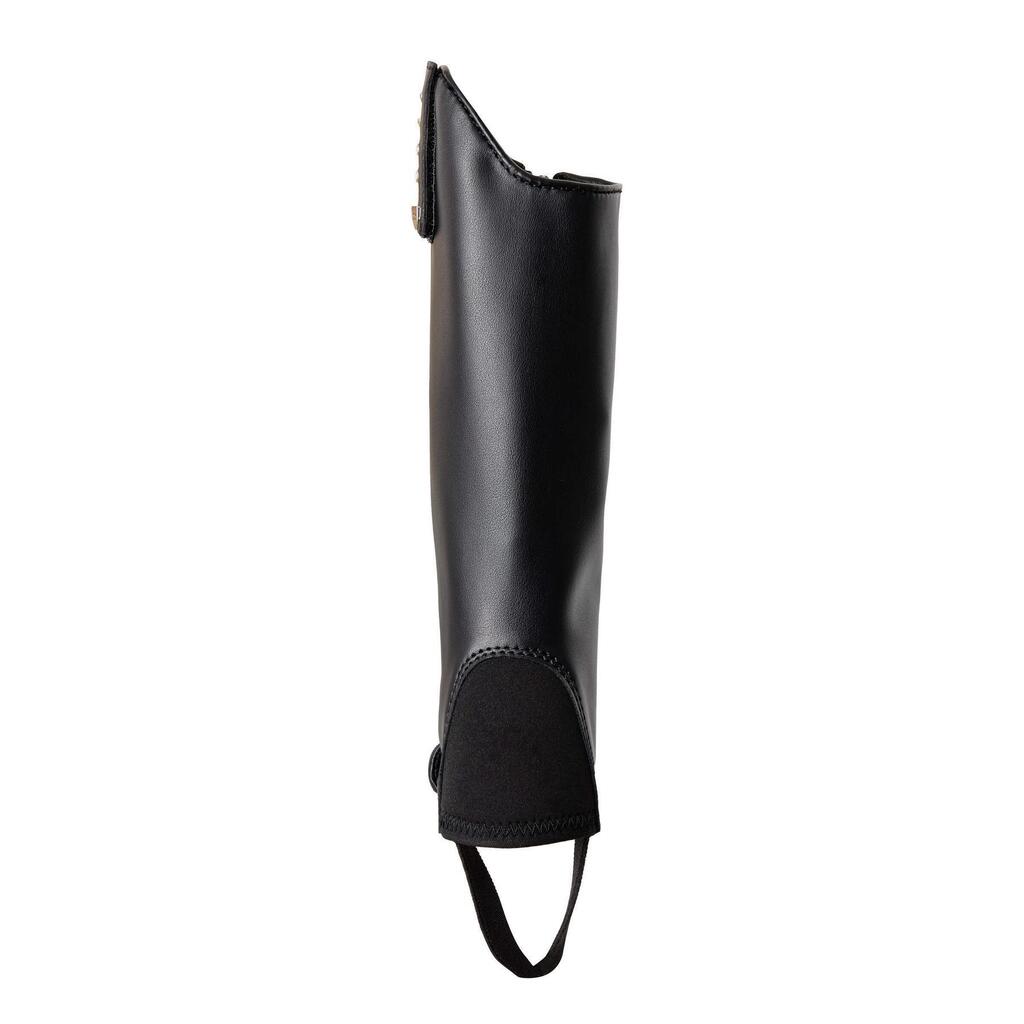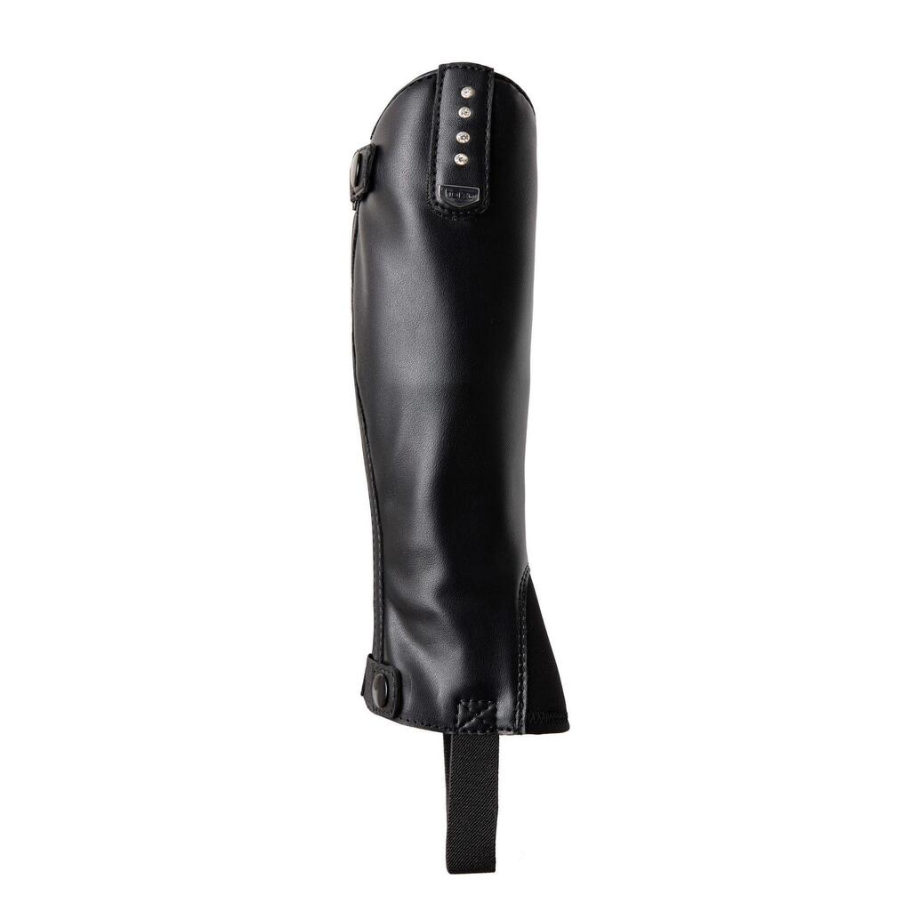 Don't want to wear plain, boring mini-chaps when you're at the barn? These chaps are a perfect match for the Portland kids Jodhpur boots (# 38268) with their subtle crystal embellishments. They feature a removable trim, one with crystals to match the jodhpurs and one plain. The stretchy synthetic leather is comfortable to wear and provides a snug fit around the leg. The YKK zipper at the back is durable and secured with two buttons (top and bottom) with elastic. An elastic strap goes around the booties and a soft neoprene flap covers the top.