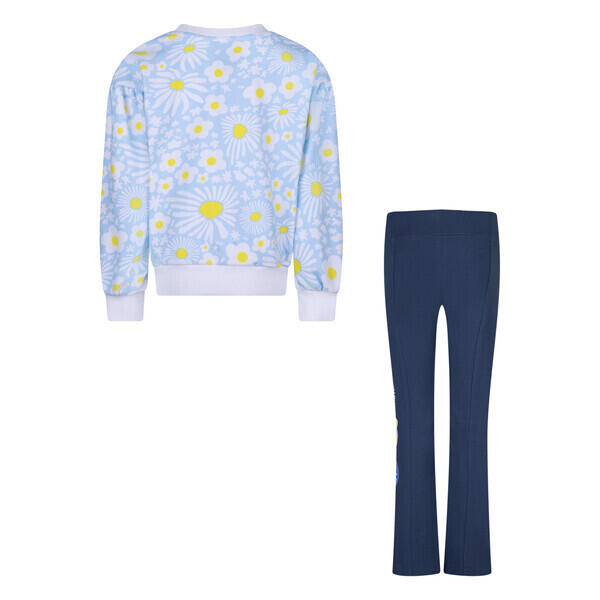 The sweatshirt features Converse 's iconic logo printed large on the front in a contrasting hue, while the leggings sports a fun and colorful all-over print. Both pieces are made from a soft, comfortable fabric, perfect for a day of play or relaxation.