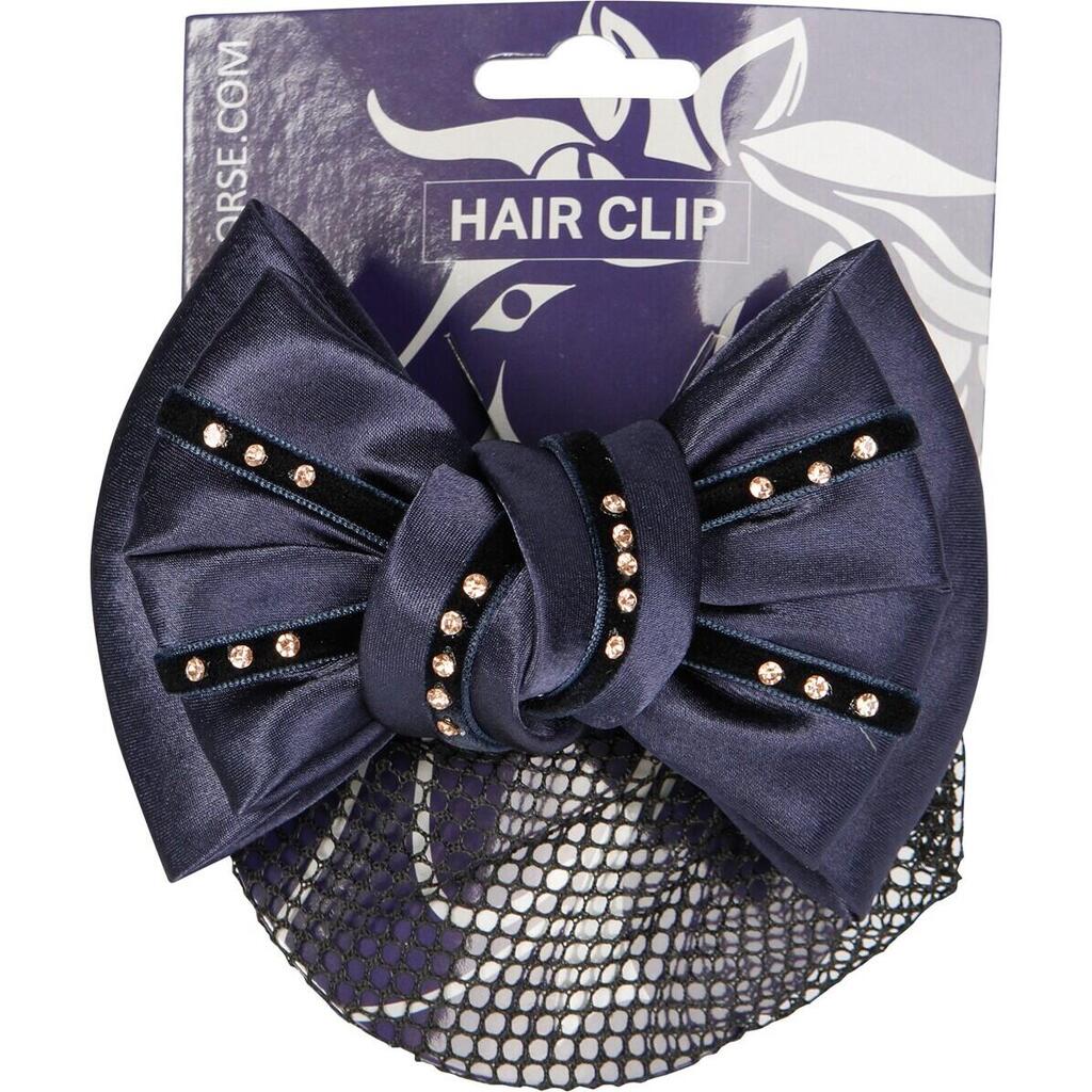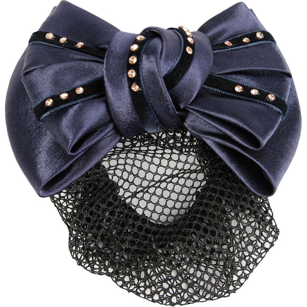 Luxe haarstrik met haar/knotnet. Gedecoreerd met fluwelen strepen met daarop rosegold strass-steentjes.