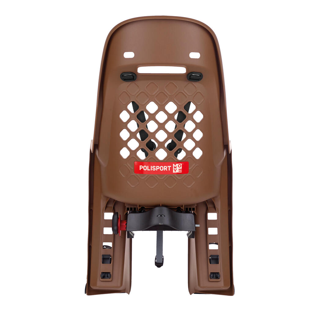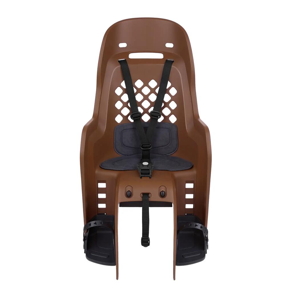 Ventilated seat with large side protection. Compatible with ISO 11243:2016 racks, max 27kg. Width 120-175mm and tubes Ø10-16mm. Child: 9-22kg/9 months-6 years. For MTB, city, and electric bikes.